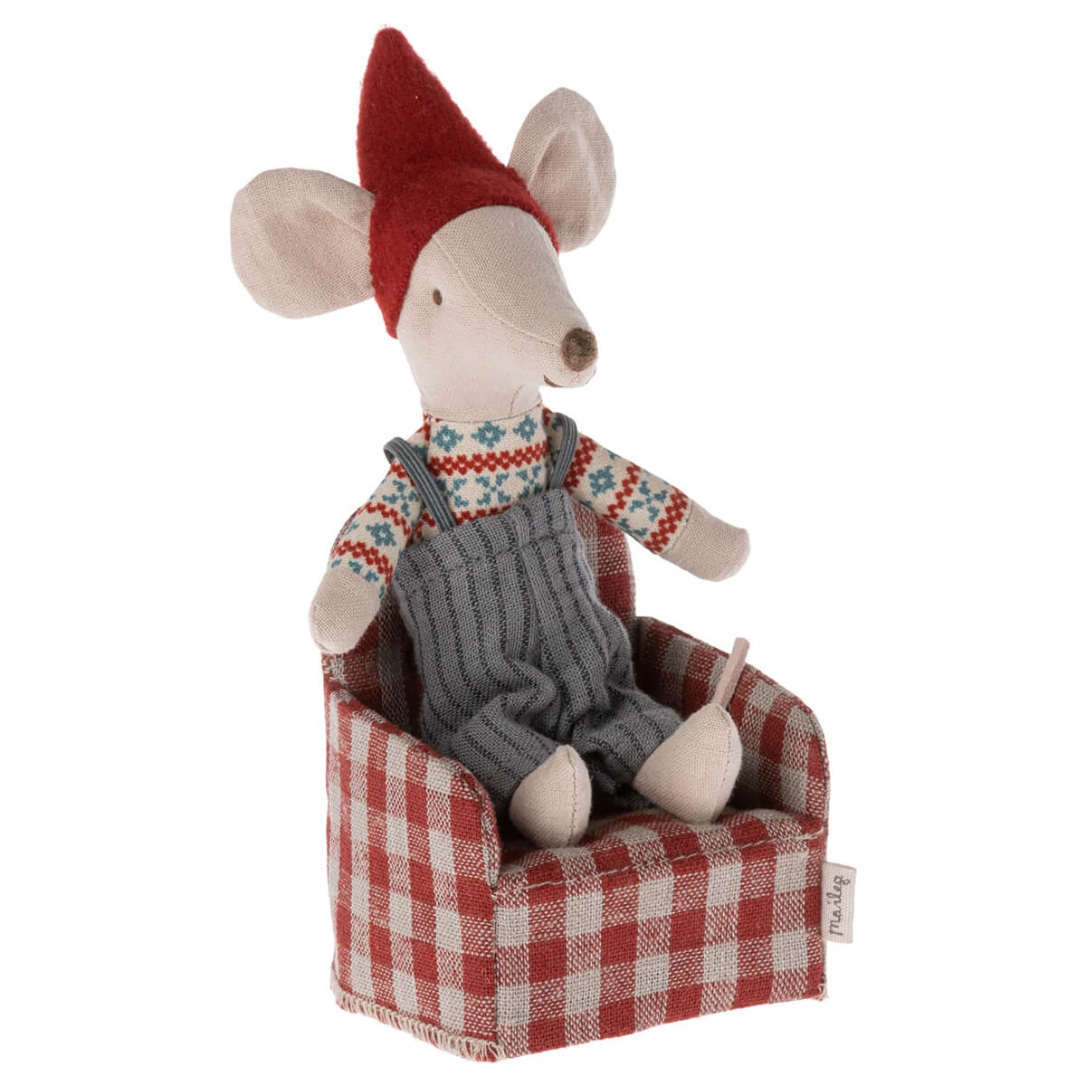 Mouse chair by Maileg.  A perfect place for your small Maileg friends to take a rest. It fits nicely into the Maileg Gingerbread House. The chair is delivered flat packed and is easy to fold and assemble.