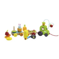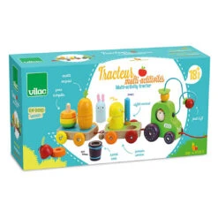 Multi activity tractor toy by Vilac. Beautifully made multi purpose toy, incorporating a pull along vehicle, a bead maze, stacking and sorting shapes and sensory elements. An absorbing wooden toy that will promote motor skills and help the child develop. Beautifully designed by specialist French toymakers Vilac. Vilac have been producing timeless heirloom toys since 1911.