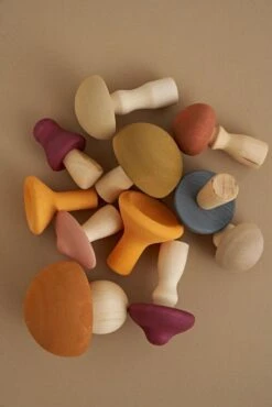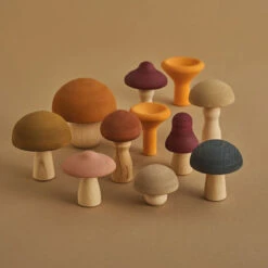 Mushrooms set by Raduga Grëz. 11 piece mushroom set which includes a variety of mushrooms in different shapes and sizes. Great for role playing and imaginative play. Comes with a cotton drawstring bag for storage.