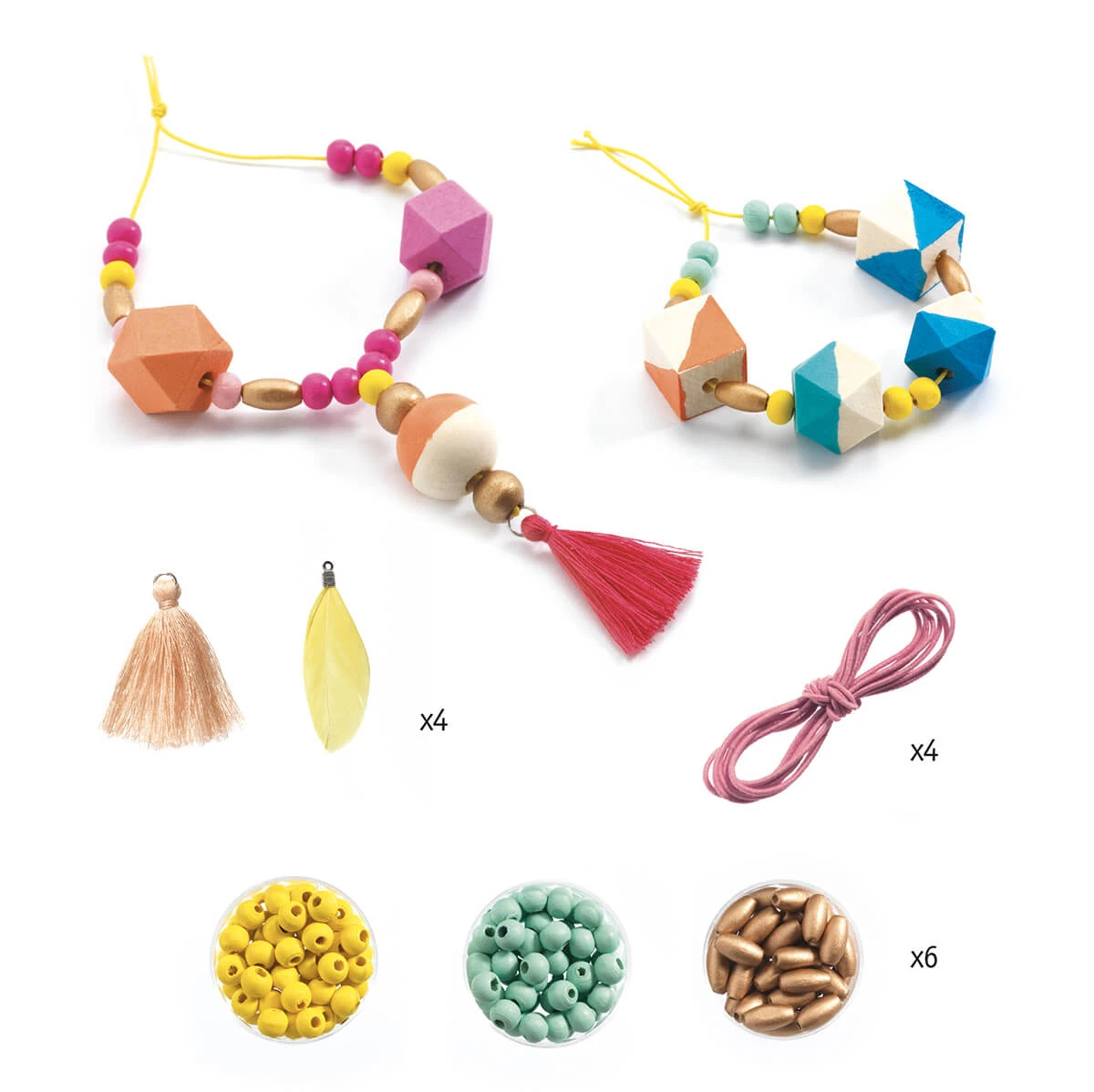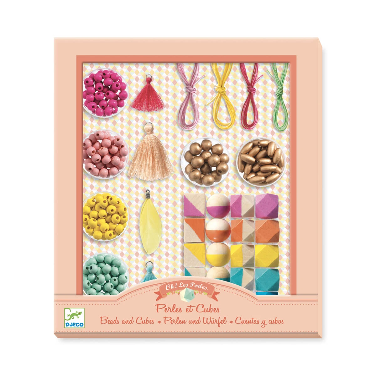 Oh! Les Perles Beads and Cubes jewellery kit by Djeco. Create simple necklaces and bracelets by threading the small coloured pearl beads and larger wooden cubic and spherical beads onto the coloured elastic provided. Also includes a lovely selection of tassels to finish off your creation. No clasps required. Kit includes over 200 accessories.