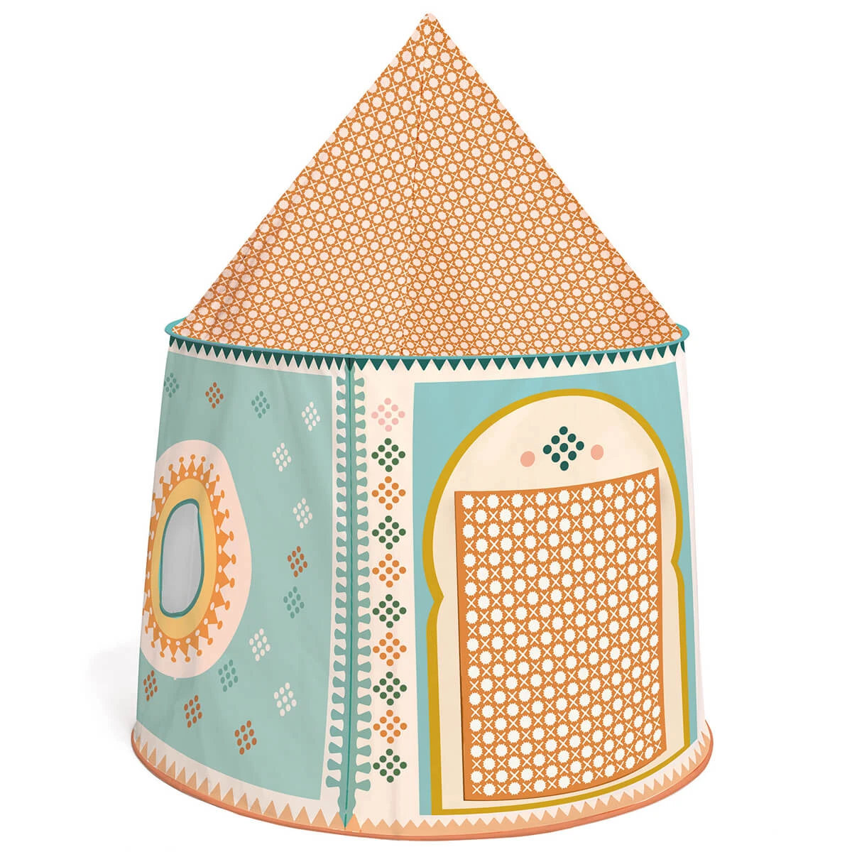 Oriental Tent by Djeco. A soft patterned fabric tent with flap door and window openings that can be tied open. Best suited for indoor use. Non woven fabric with plastic reinforcements. Easy to install with a simple plastic rod construction, and compact when stored.