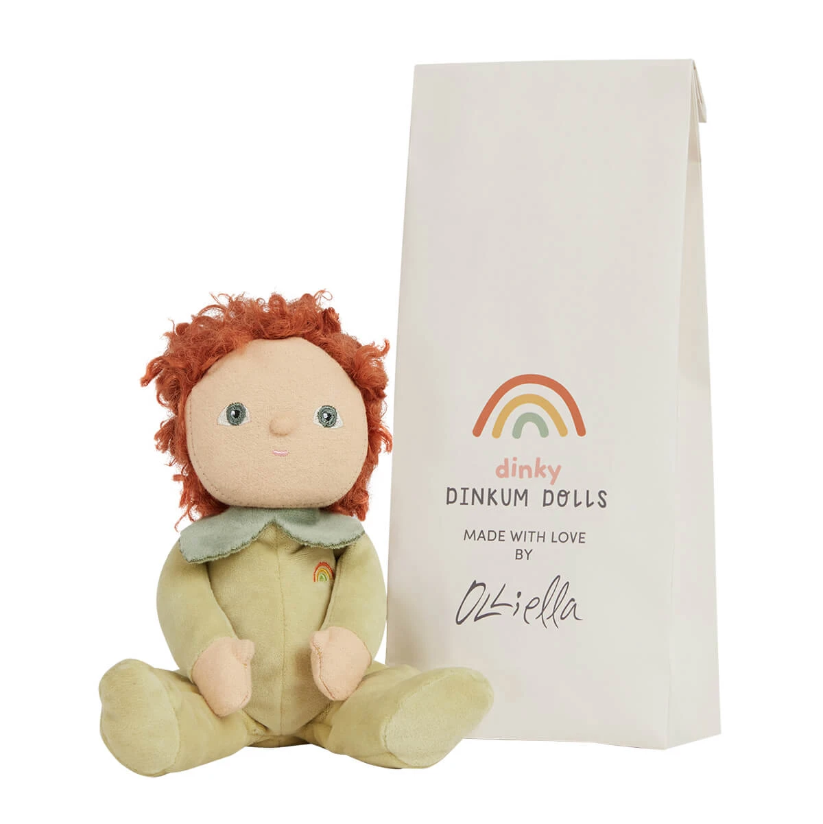 Patty Pear Dinky Dinkums Doll by Olli Ella. Your heart will melt when you hold them, as they snuggle floppily into the palm of your hand. Say hello to Patty Pear! A limited-edition palm-sized playmate, perfectly weighted in all the right places, and outfitted in snuggly plush velvety cotton making Dinky Dinkums the smallest, sweetest snuggle companion.