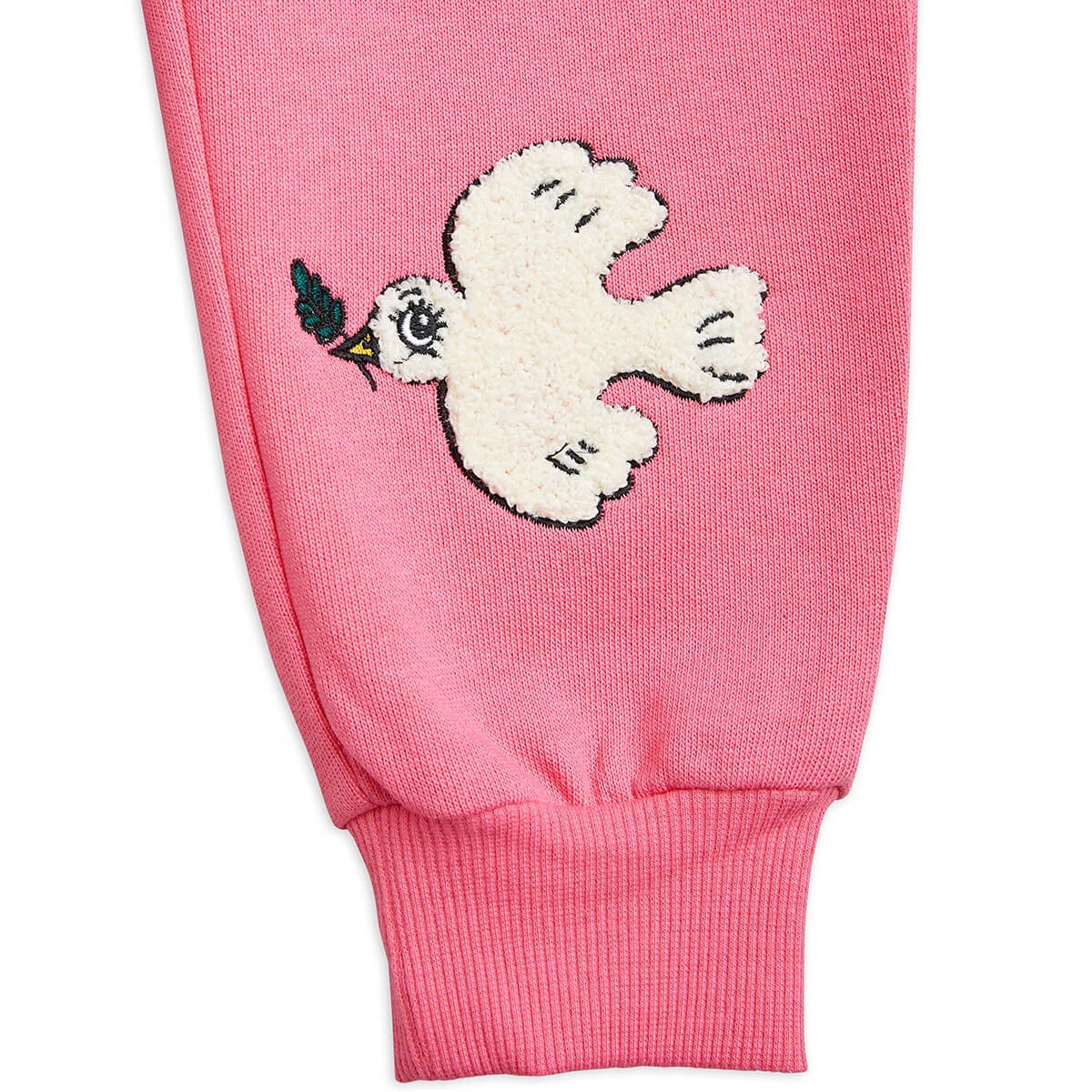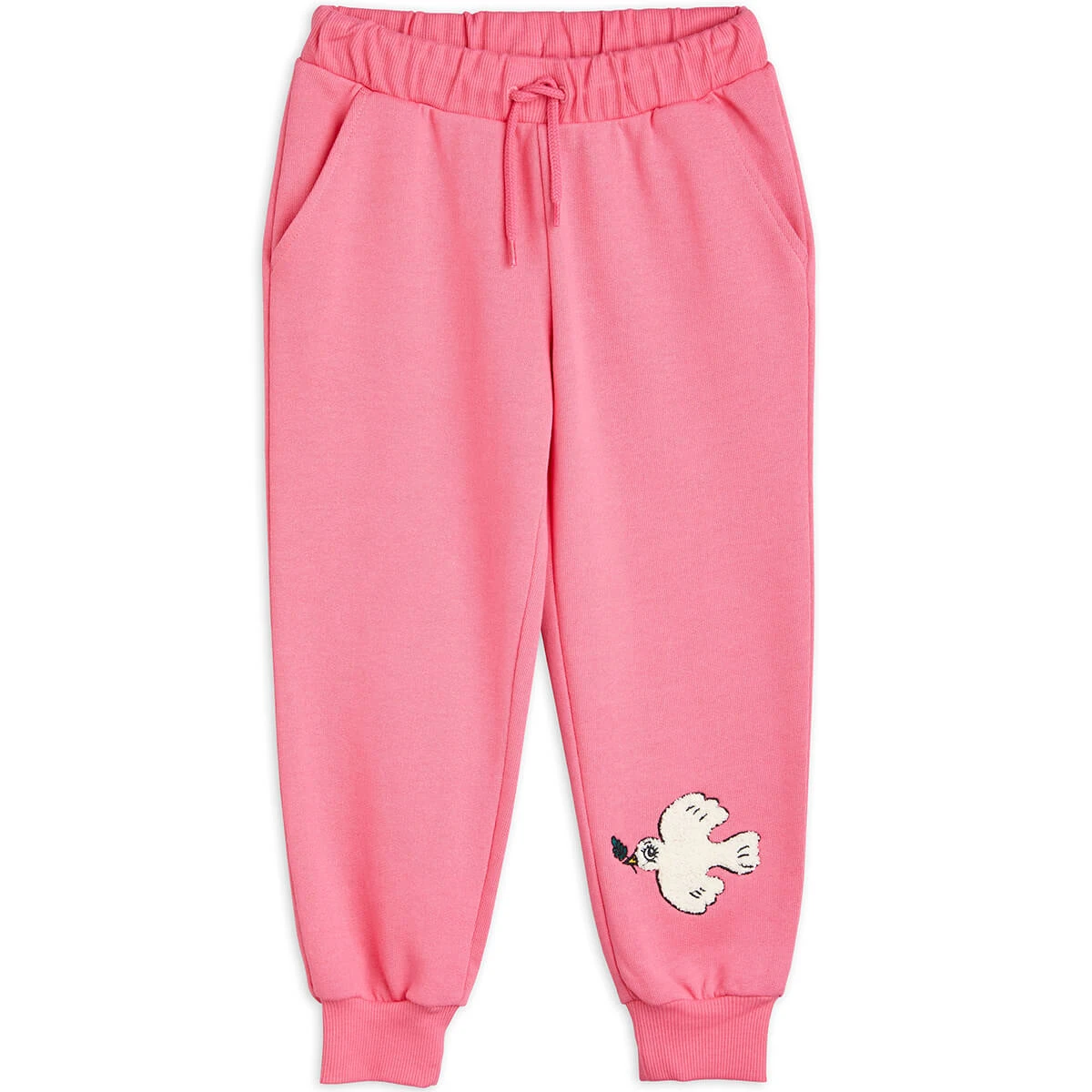 Peace Dove Sweatpants in Pink by Mini Rodini. Sweatpants made from 100 % certified organic cotton featuring a chenille embroidered Peace Dove patch. Designed with an elastic drawstring waist as well as ribbed cuffs and side pockets.
