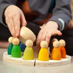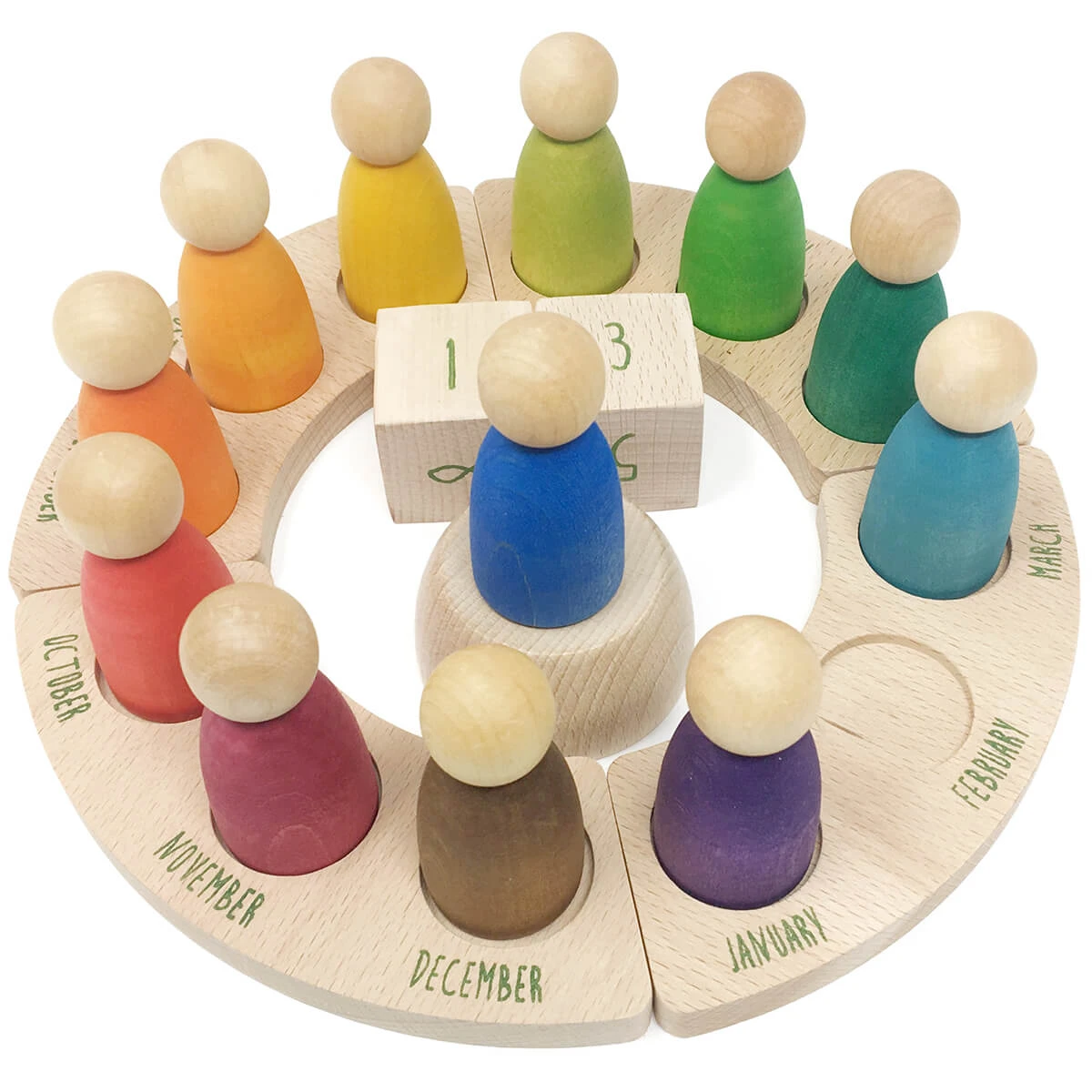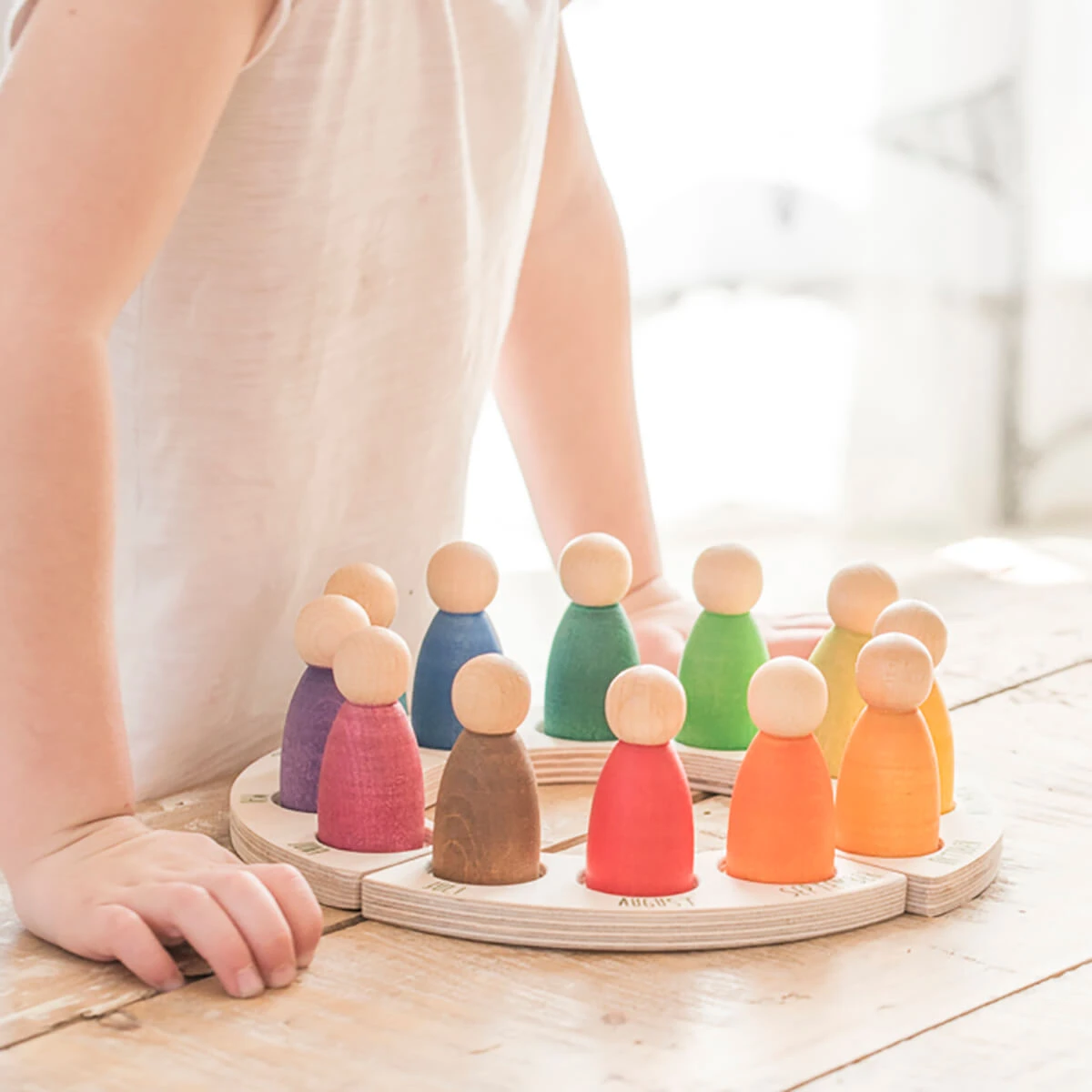 Perpetual Calendar by Grapat. The calendar set contains 12 Nins in 12 colours according to the Waldorf pedagogy to determine the month and season. The set also includes a natural beech wood bowl, 2 natural beech wood cubes with the numbers of the days printed, and a four section platform stamped with the months of the year split into the seasons. A manipulative and active manual calendar that allows the child to touch the year and understand the passage of time through the experience.