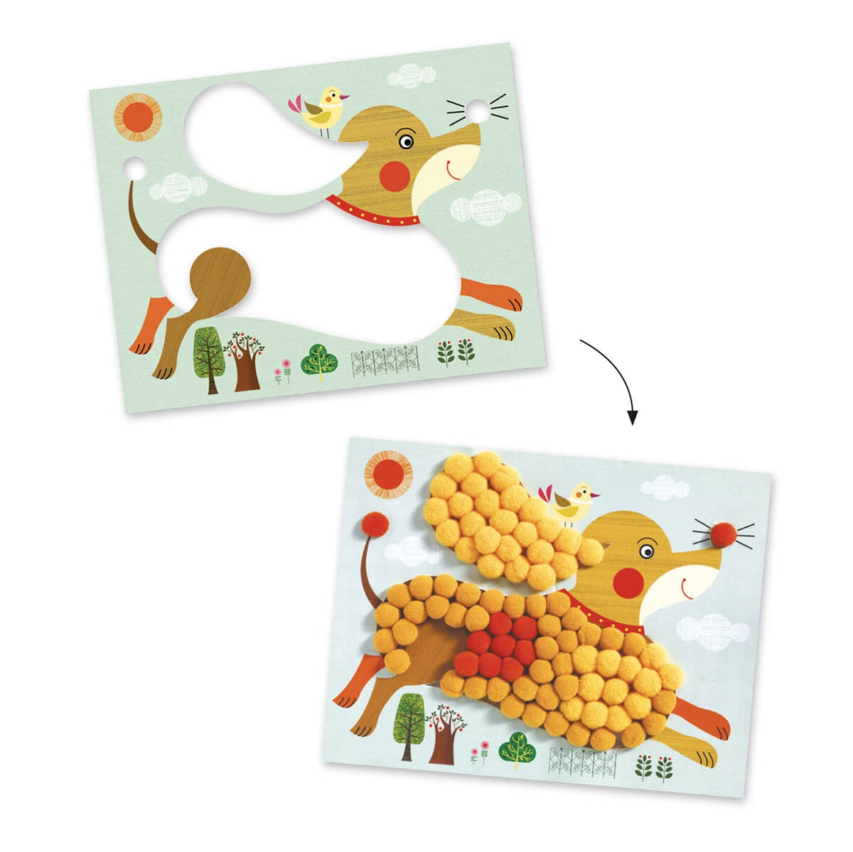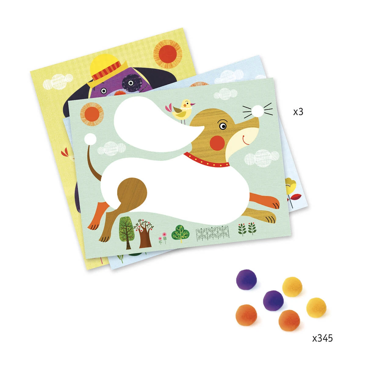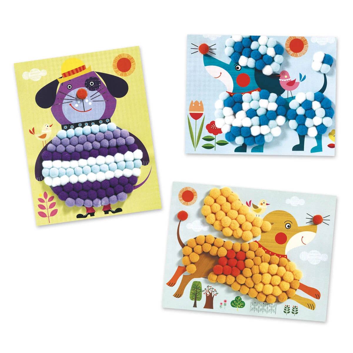 Pompom Puppies craft kit by Djeco. Decorate the 3 different boards featuring cute puppies with colourful pompoms. Simply remove the pre-cut shapes, then add the pompoms to the sticky area to reveal three sweet dog to stroke.  Kit includes 3 sticky boards and 345 pompoms.