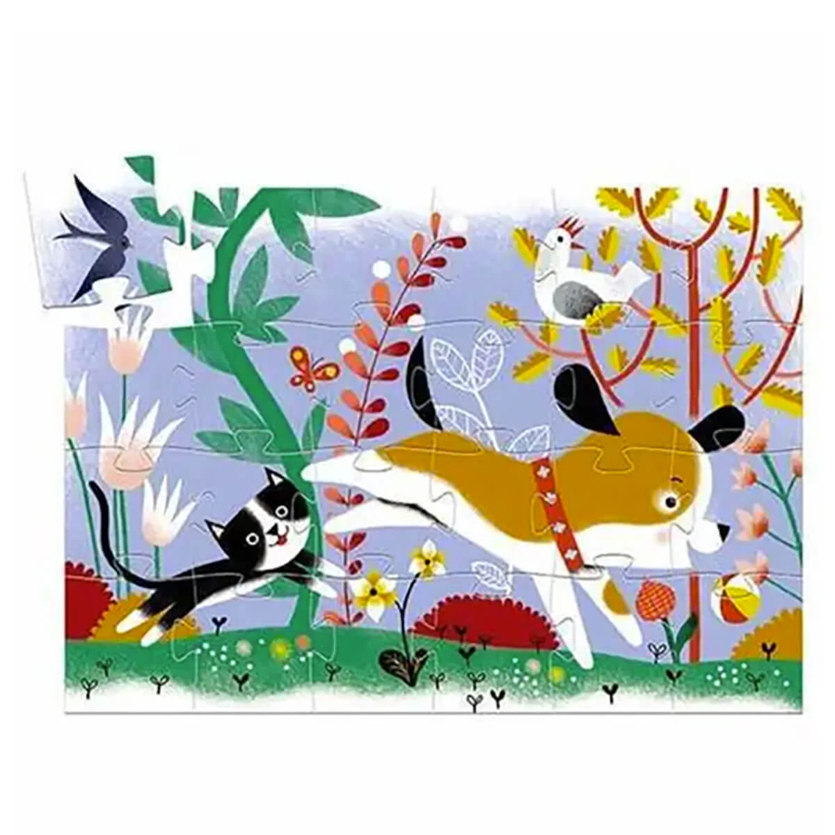 Puppy 24 piece puzzle by Djeco. Contains 24 pieces, creating an image of sweet puppy and cat playing in the garden.
