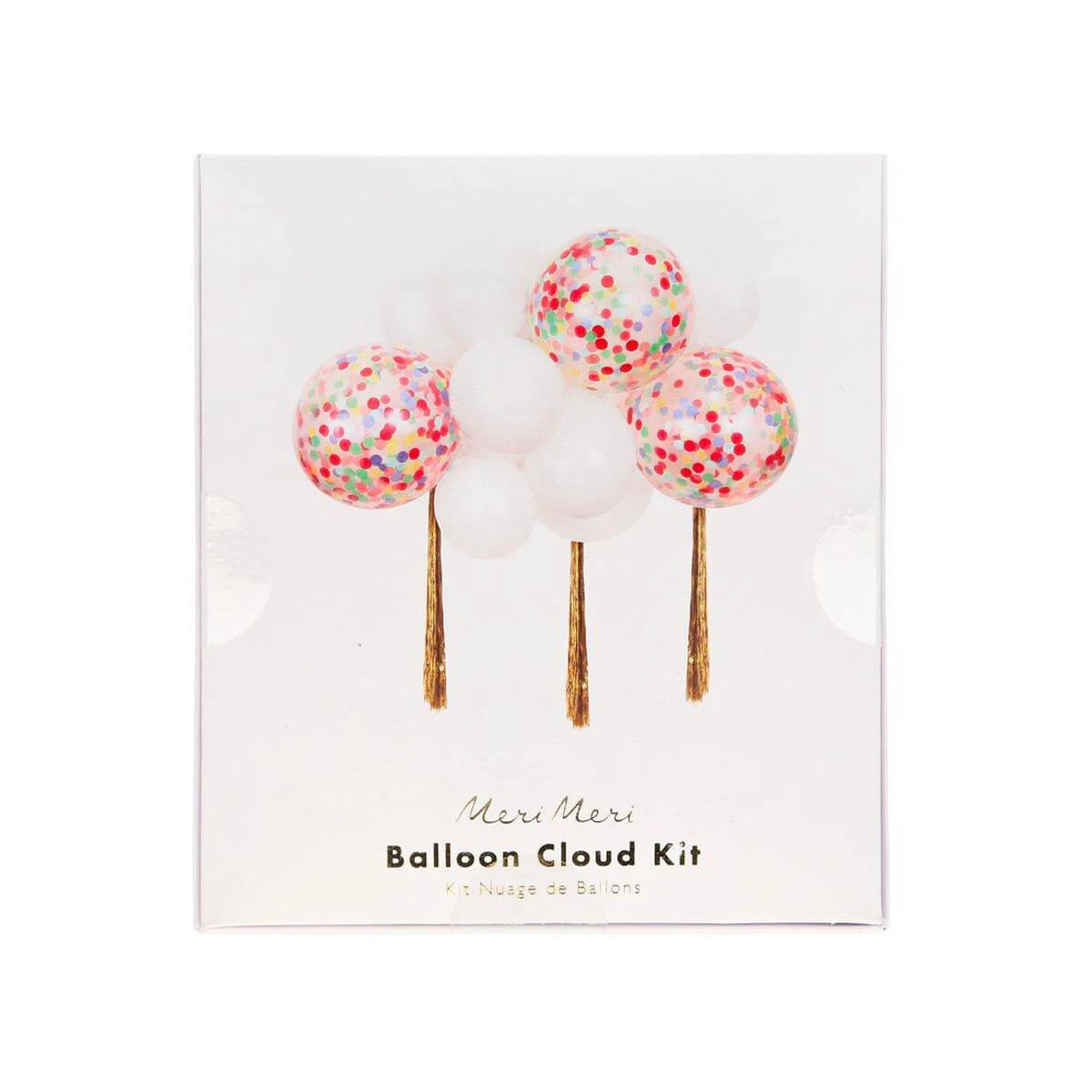 Rainbow balloon cloud kit by Meri Meri.  The rainbow balloon cloud kit will add a touch of beautiful brightness to any party. It contains fourteen balloons, four of which are pre-filled with colourful confetti, for a sensational look. It also has three golden streamers which are so stylish. It creates a three-foot balloon cloud that will really impress your guests!
