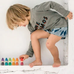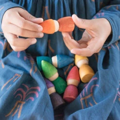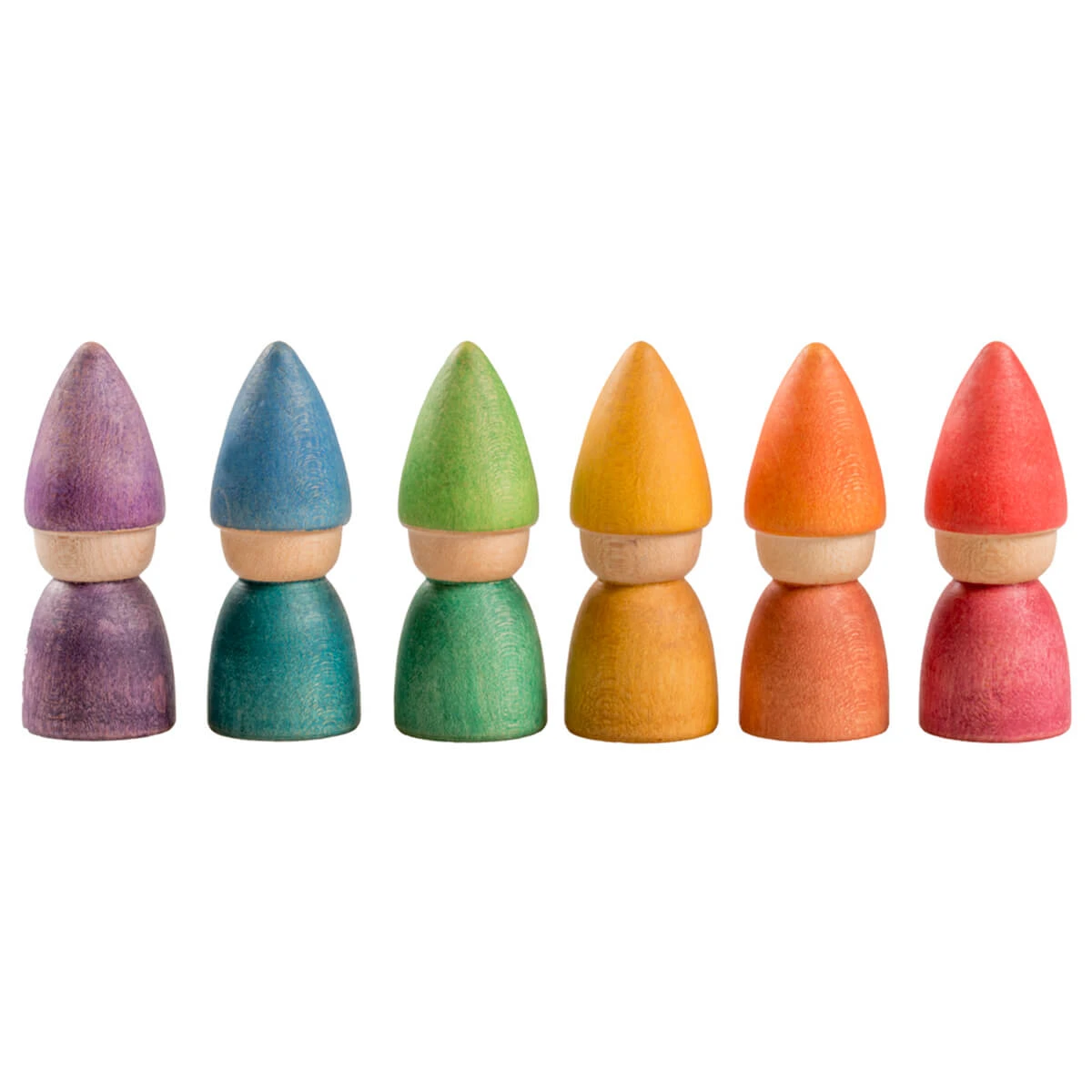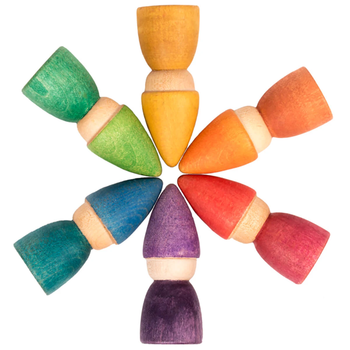 6 rainbow Tomtens by Grapat. Hand made wooden toys for symbolic play, learning and sensory games. The Tomtens do not have facial features, allowing the child to develop their own characters and stories.