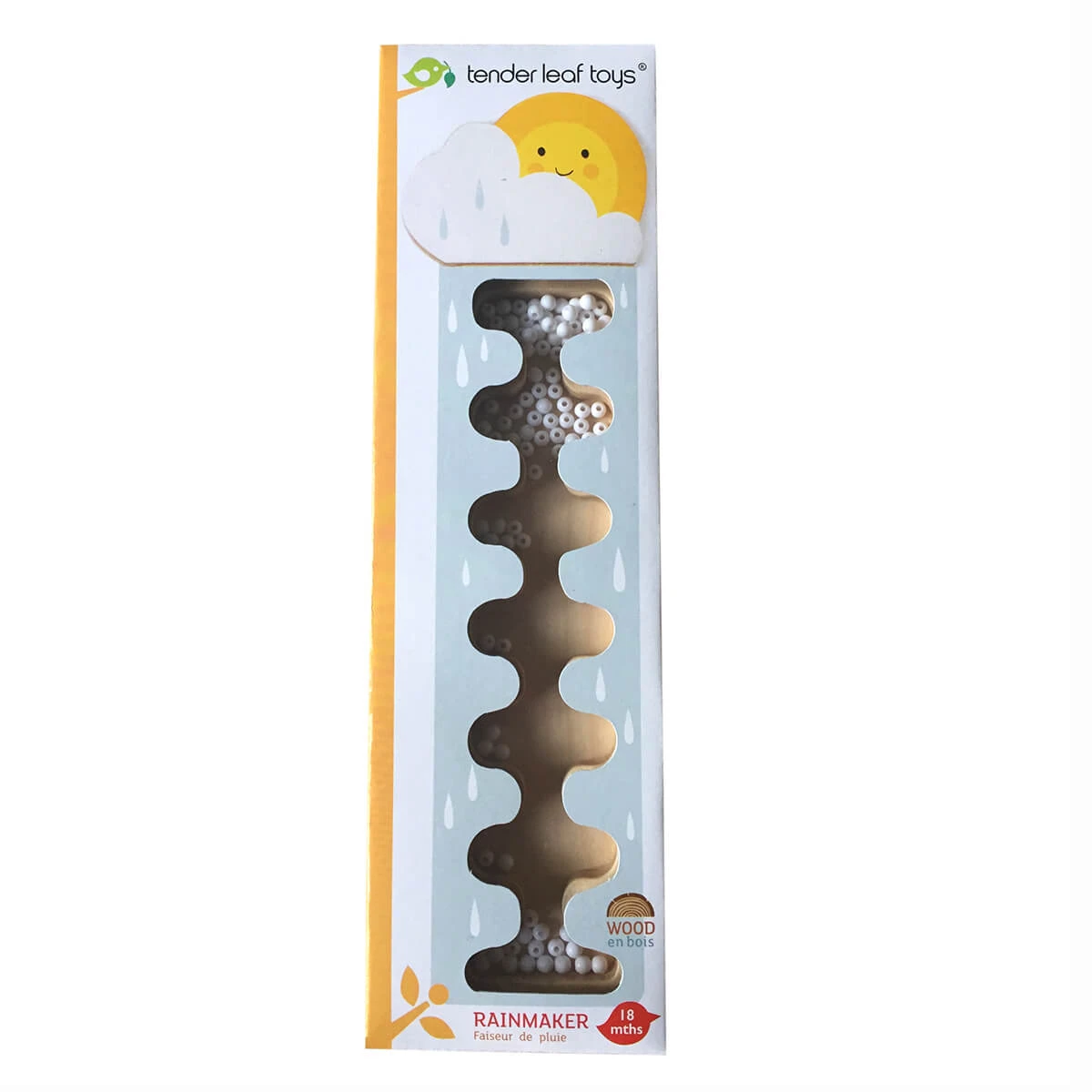 Rainmaker by Tender Leaf Toys. Listen to the sound of the rain with this wooden rainmaker. Filled with small white beads, and topped with a sweet little smiley sun face!