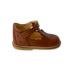 Leather starter shoes with scallop detail by Angulus. T bar Mary Jane style shoes with adjustable velcro strap. Closed toe and solid heel cap for maximum support. Soft and flexible crepe rubber sole. Lined with 100% chrome-free leather.