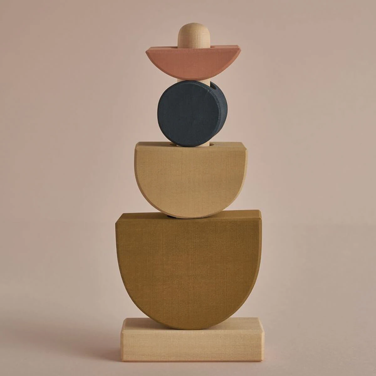 Shapes by Raduga Grëz.  Includes 4 stacking sculptures with a central rod, in earthy colours. Made from solid lime wood and dyed with non-toxic watercolours. Great for developing hand-eye co-ordination and counting skills. Comes with a cotton drawstring bag for storage.
