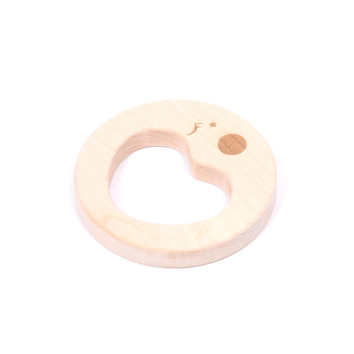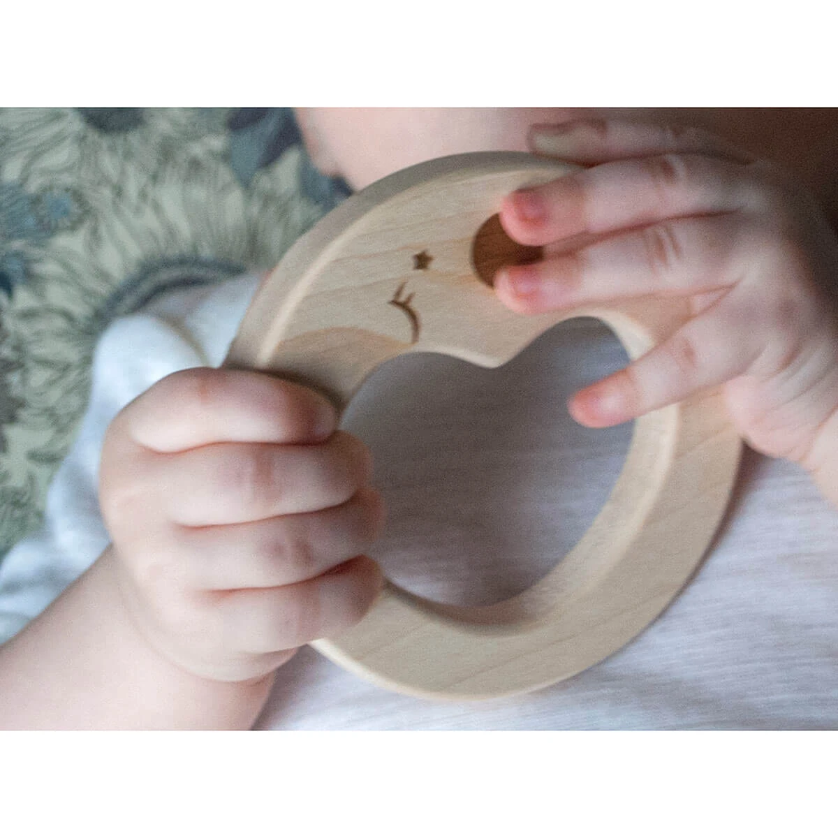 Moon shaped natural baby teether by Loullou.  Made from selected eco-friendly Maplewood from FSC-certified suppliers, absolutely free of any chemicals.  With rounded edges that are sanded and smoothed to naturally soothe sore and delicate gums, and a hole for your little one to grab and hold.  Can also be tied to the 1st Play baby gym by Loullou and used as a baby gym toy.