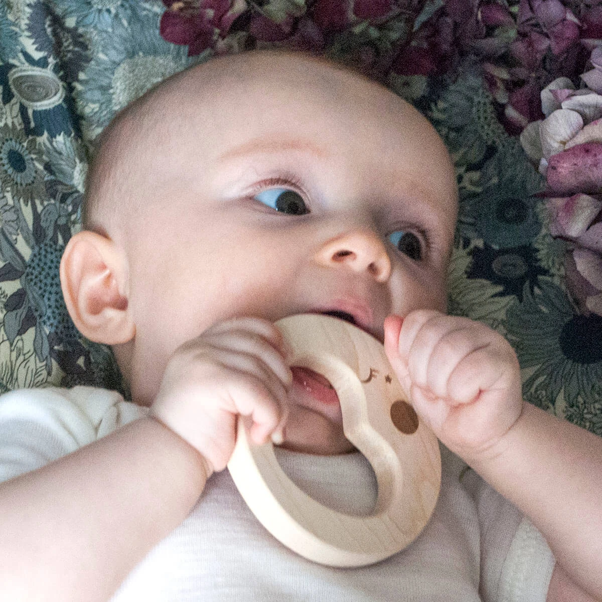 We love these natural teethers by Loullou, perfect for tying onto the baby gym too.