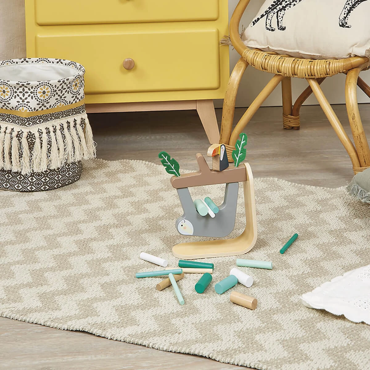 Sloth balancing game by Janod. Our sloth is just taking a nap. But he’s forgotten something: it’s playtime! Rise and shine for this attractive wooden game of skill for kids aged 3 and over! This balancing game features a sloth hanging from its branch, and 15 sticks. It can be played by one or more players. The aim of the game? Put as many sticks on the sloth’s belly as you can before it lets go of the branch! The player who puts on one stick too many is the loser! Each leave in this pretty game is made of soft felt. This game is perfect for developing patience and dexterity.