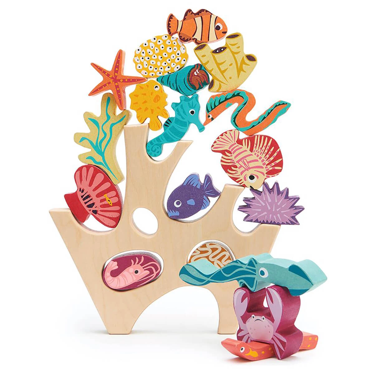 Stacking Coral Reef by Tender Leaf Toys. This under-the-sea themed stacker is inspired by our lovely oceans and the beautiful coral reefs. We love to teach our little ones about animals and sea life, and this plastic-free toy stacker will not disappoint. Stack the sea creatures and shells on top of the coral rock, and see if you can balance them all!Â