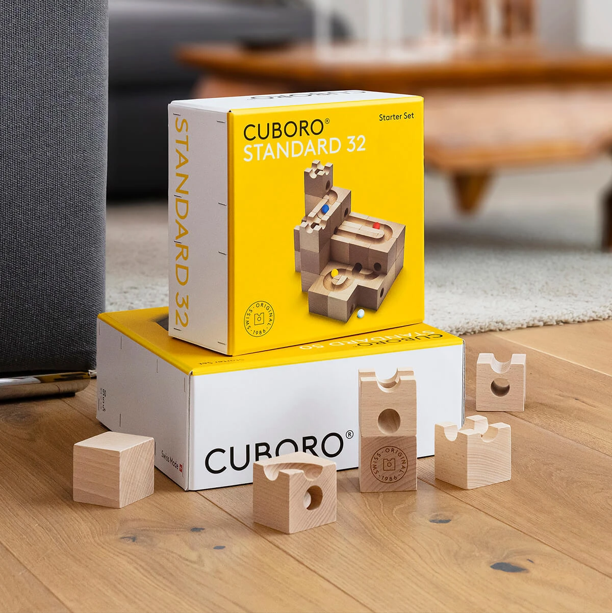 Standard 32 Marble Run Set by Cuboro. This medium sized starter set features all the basic elements of the world of Cuboro. Use rails and cubes to create original structures and your first exciting marble runs. With further Cuboro sets you can combine the starter elements step by step into larger track systems.