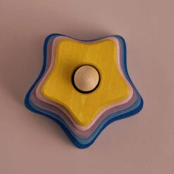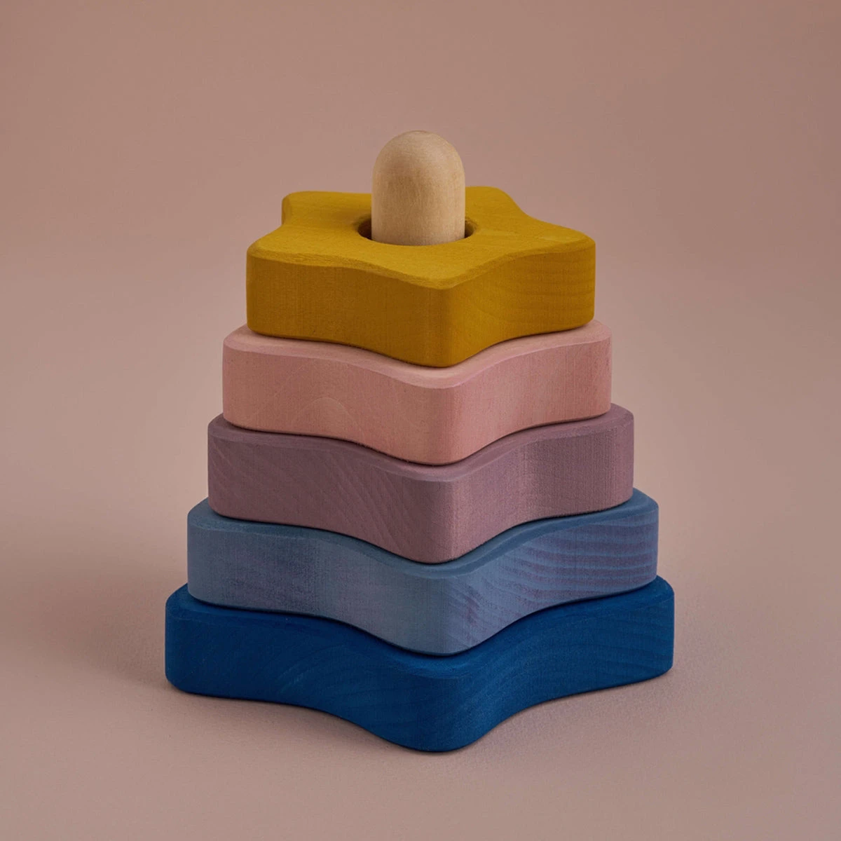 Star stacking tower by Raduga Grëz. Includes 5 stacking stars with a central rod in multi colours. Made from solid lime wood and dyed with non-toxic watercolours. Great for developing hand-eye co-ordination and counting skills. Comes with a cotton drawstring bag for storage.