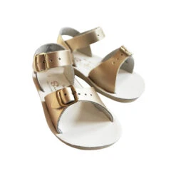 Surfer sandals by Salt-Water.  The Surfer is your classic two strap Jesus sandal. The adjustable toe buckle and ankle strap makes it the best all-rounder for both wide and narrow feet.  The entire Sun-San range has a spongy urethane sole with rust proof buckles. They can be worn in water and hand washed with a gentle detergent. They are supremely comfortable and you might find this is the only shoe your little one will want to wear. The Surfer style is Salt-Water’s bestselling unisex style and goes with everything. Â