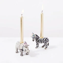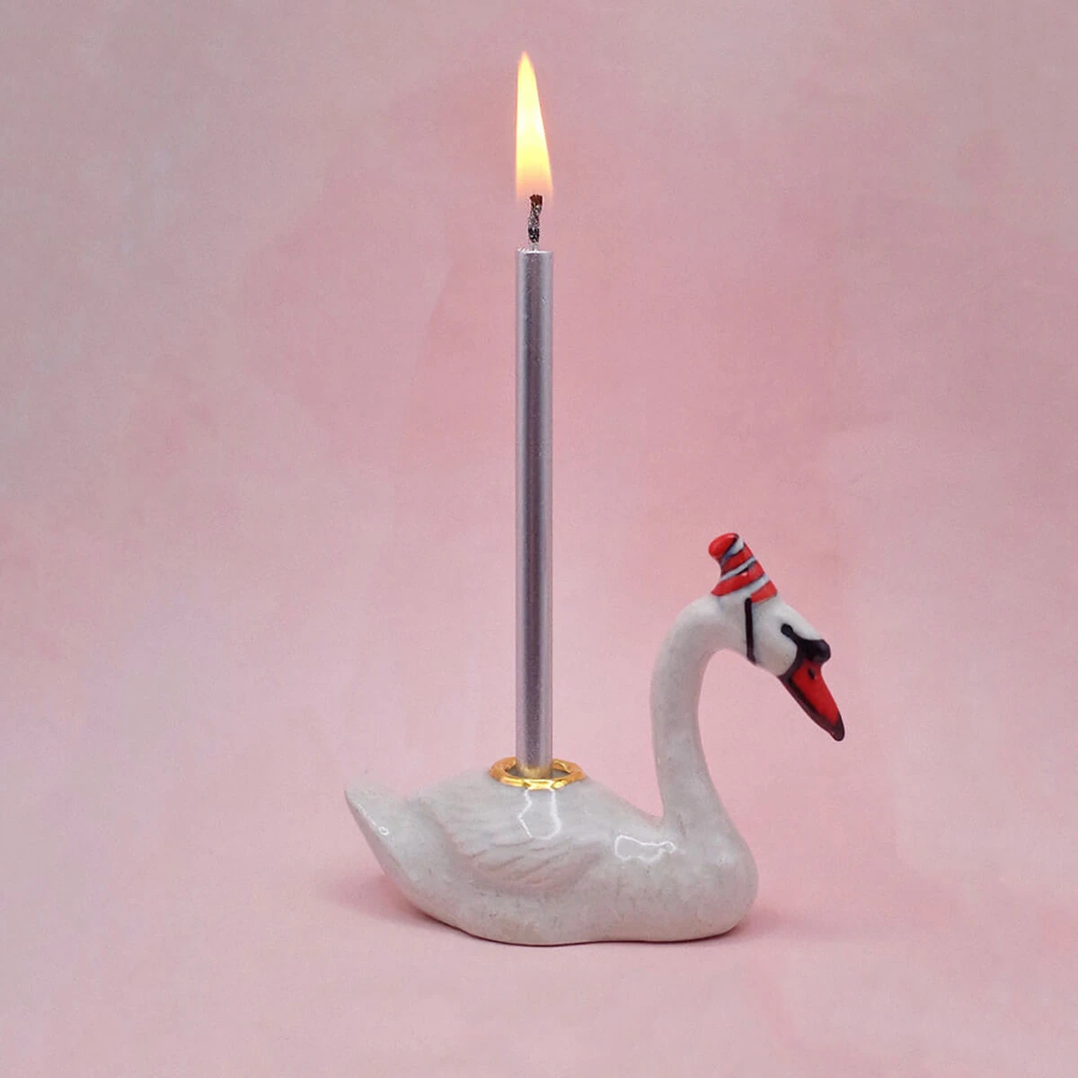 Swan Party Animal ceramic cake topper by Camp Hollow. Start a celebration with this party-animal inspired collectible keepsake, featuring a gold lustre cup that holds a standard size birthday candle. Crafted in fine porcelain and meticulously hand-painted, this beautiful heirloom quality candle holder will celebrate every birthday and occasion for years to come.