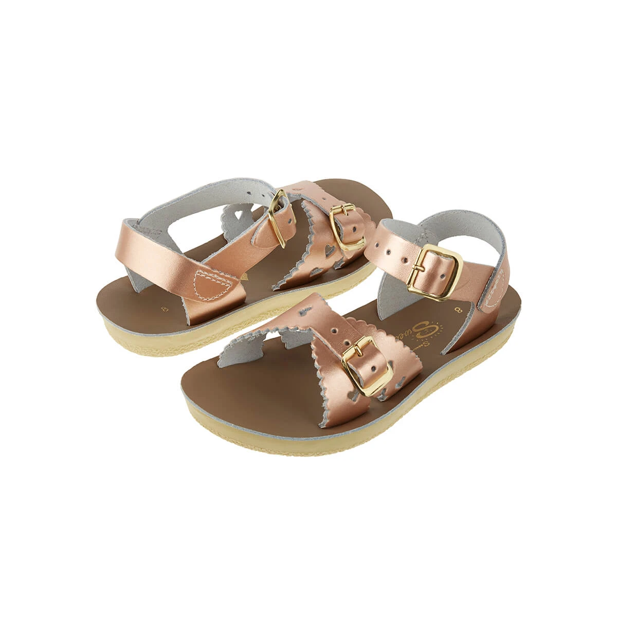 Sweetheart sandals by Salt-Water. A pretty sandal with heart shape cut-outs and scalloped edges. The Sweetheart is fully adjustable with buckled toe and ankle straps. The entire Sun-San range has a spongy urethane sole with rust proof buckles. They can be worn in water and hand washed with a gentle detergent. They are supremely comfortable and you might find this is the only shoe your little one will want to wear.