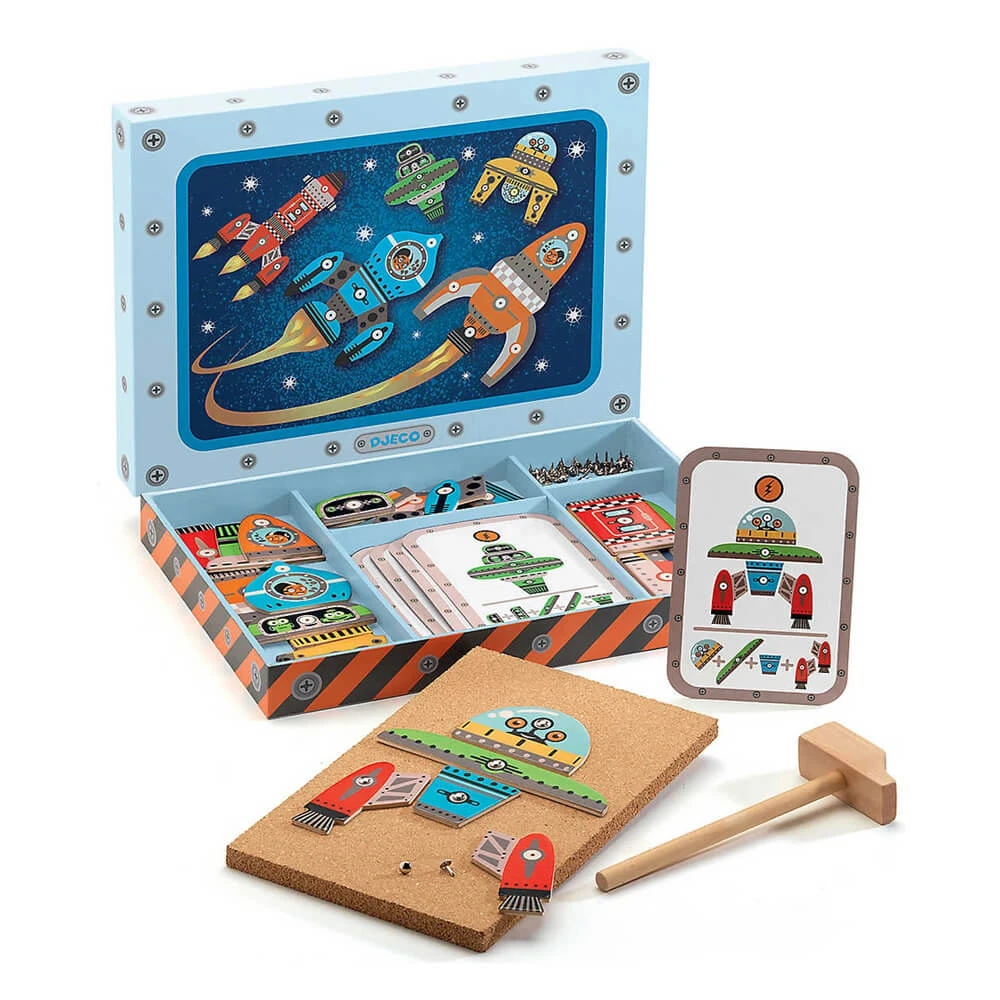 Tap tap space game. Make spaceships from the individual wooden pieces , the set contains, 1 cork board, a hammer, 5 instruction cards, approx 40 pegs and wooden space shapes.