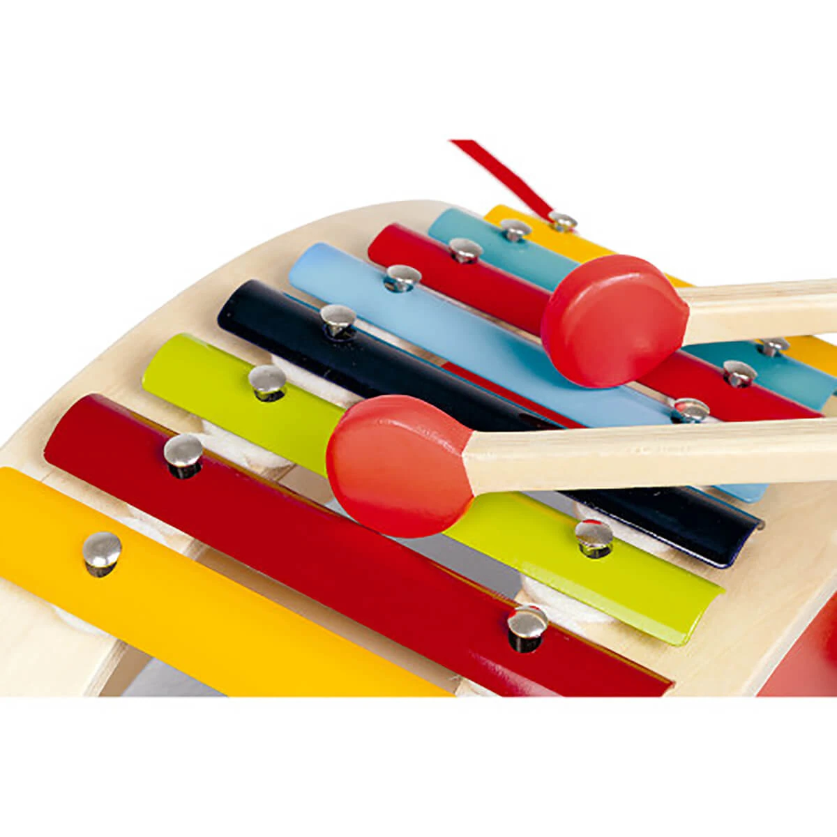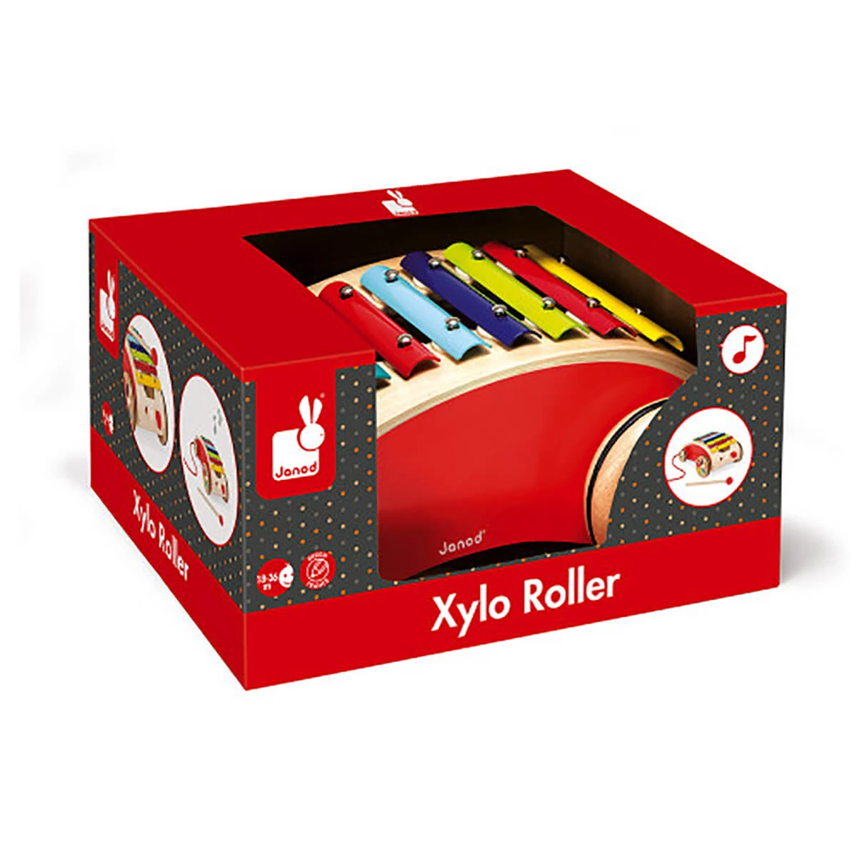 Tatoo xylophone roller toy by Janod.  Wooden and metal wylophone. 8 Metal keys. Wheels printed by heat transfert. Black rubber rings fixed on the wheels to make them silent when pulling the toy. Diatonic musical scale 2-in-1 toy- Xylophone for budding young musicians and pull toy for bringing everywhere from the time of Baby’s first steps.