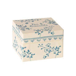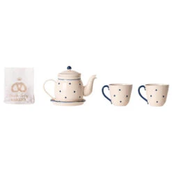 Tea and biscuits set by Maileg.  A little metal tea set comprising of a teapot with lid, two cups and a plate, plus a little bag of resin cookies. Perfect for pretend tea with your Maileg friend. Comes in a lovely storage box.