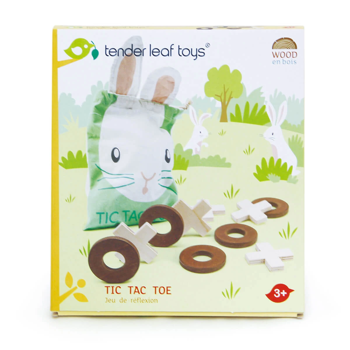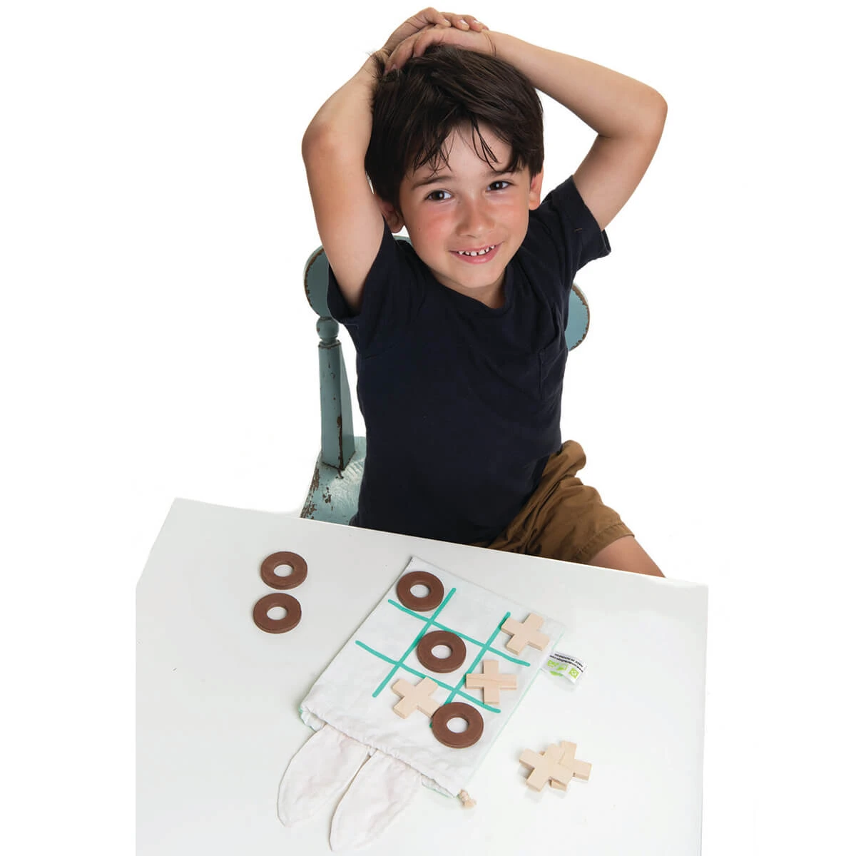 Tic Tac Toe game by Tender Leaf Toys. 5 wooden crosses and 5 wooden circles with a bunny drawstring bag, turn the bag over to play Tic Tac Toe, or Noughts and Crosses depending on where you live!