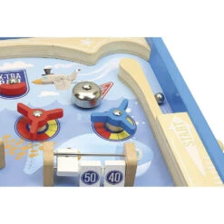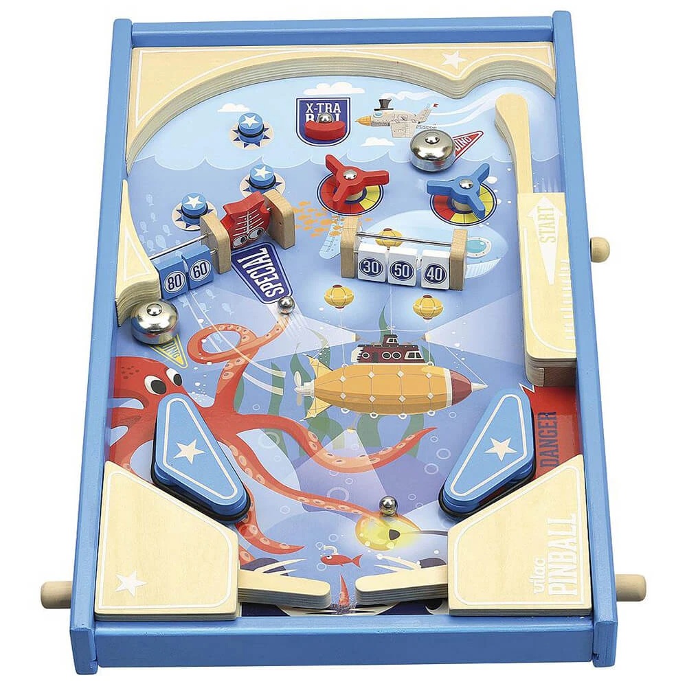 Under The Sea wooden pinball machine by Vilac. Includes working flippers, bumpers, targets and metal bells. 3 metal balls included for gameplay.