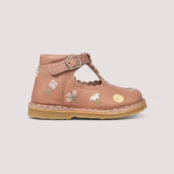 Uniqua flower scallop edge T bar starter shoes by Petit Nord. The special Petit Nord Uniqua collection features exclusive embroideries in collaboration with Shirley Bredal. The T-Bar is a Petit Nord signature style with a perfect fit due to the comfortable height and the cushioned ankle support for little walkers. Very suitable as a child’s first walking shoes and for toddlers. Petit Nord’s signature scallop trimming has been added along the t-edges, making this model feminine and pretty. It has a practical velcro closure with buckle detailing and our durable Petit Nord signature sole.