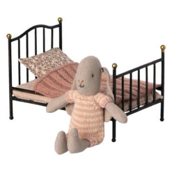 Vintage metal bed in anthracite by Maileg. A perfect bed for a good night sleep. The bedlinen is made in beautiful Maileg printed fabrics and includes a blanket, mattress and pillow, all different but always carefully chosen to make the look complete. Fits small bunnies and Maileg mice.