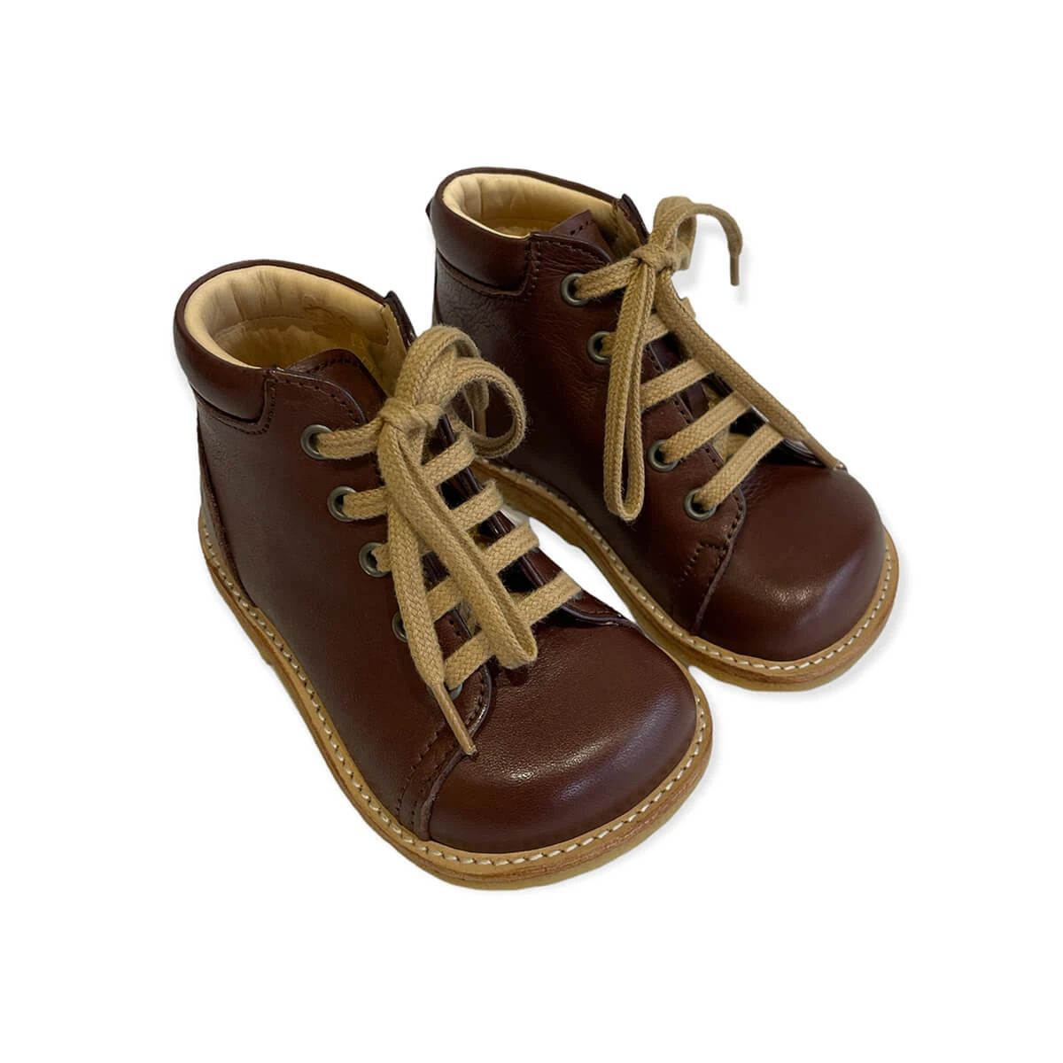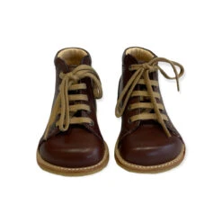 Lace up starter boots in a wider fitting by Angulus. Leather lace up boots with stitching detail, ideal as first walkers as they provide very good ankle support, with a soft and flexible crepe rubber sole. Lined with 100% chrome-free leather.