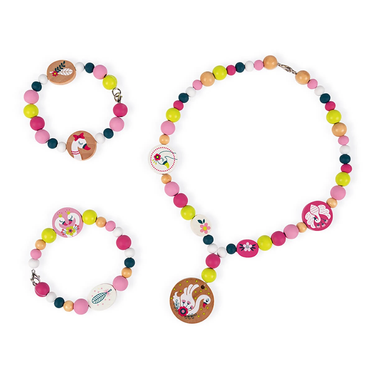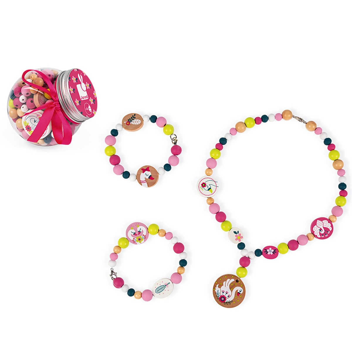 Wooden beads with swan illustrations by Janod. A pretty candy jar with a small satin bow containing 220 wooden beads, including 18 charms on the theme of birds with flouro effect. Also contains 5 clasps and 3 metres of nylon elastic thread for making your own jewellery. A great set for improving hand-eye coordination and fine motor skills, and of course having lots of creative fun!