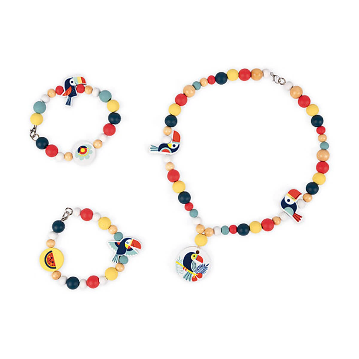 Wooden beads with toucan illustrations by Janod. A pretty candy jar with a small satin bow containing 220 wooden beads, including 18 charms on the theme of flamingoes and fruit. Also contains 5 clasps and 3 metres of nylon elastic thread for making your own jewellery. A great set for improving hand-eye coordination and fine motor skills, and of course having lots of creative fun!