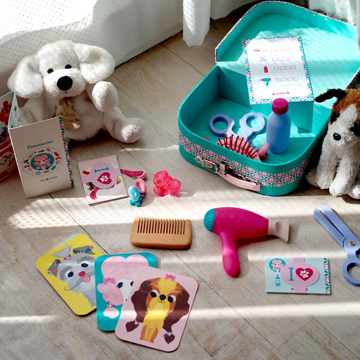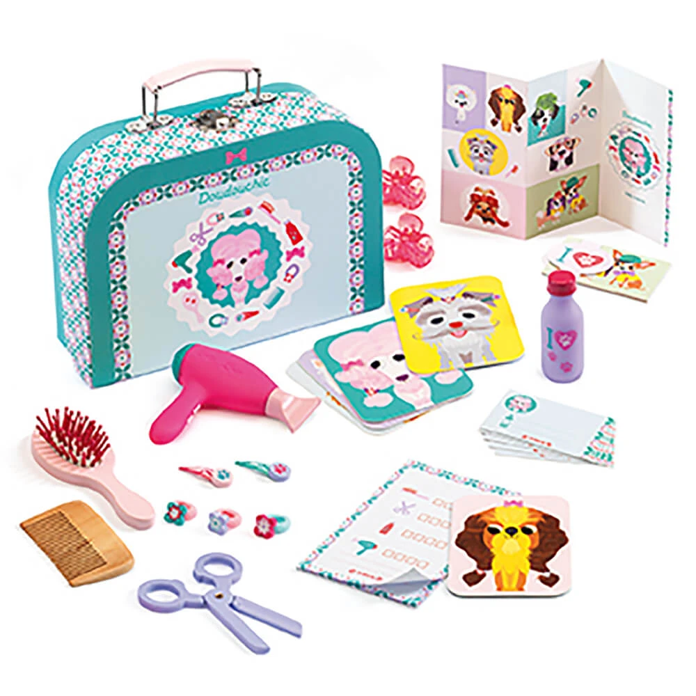 Pet salon wooden set by Djeco.  Contains a brush, scissors, hair dryer, comb and lots more to keep your pets in tip top condition., perfect for grooming your favourite cuddly toys.