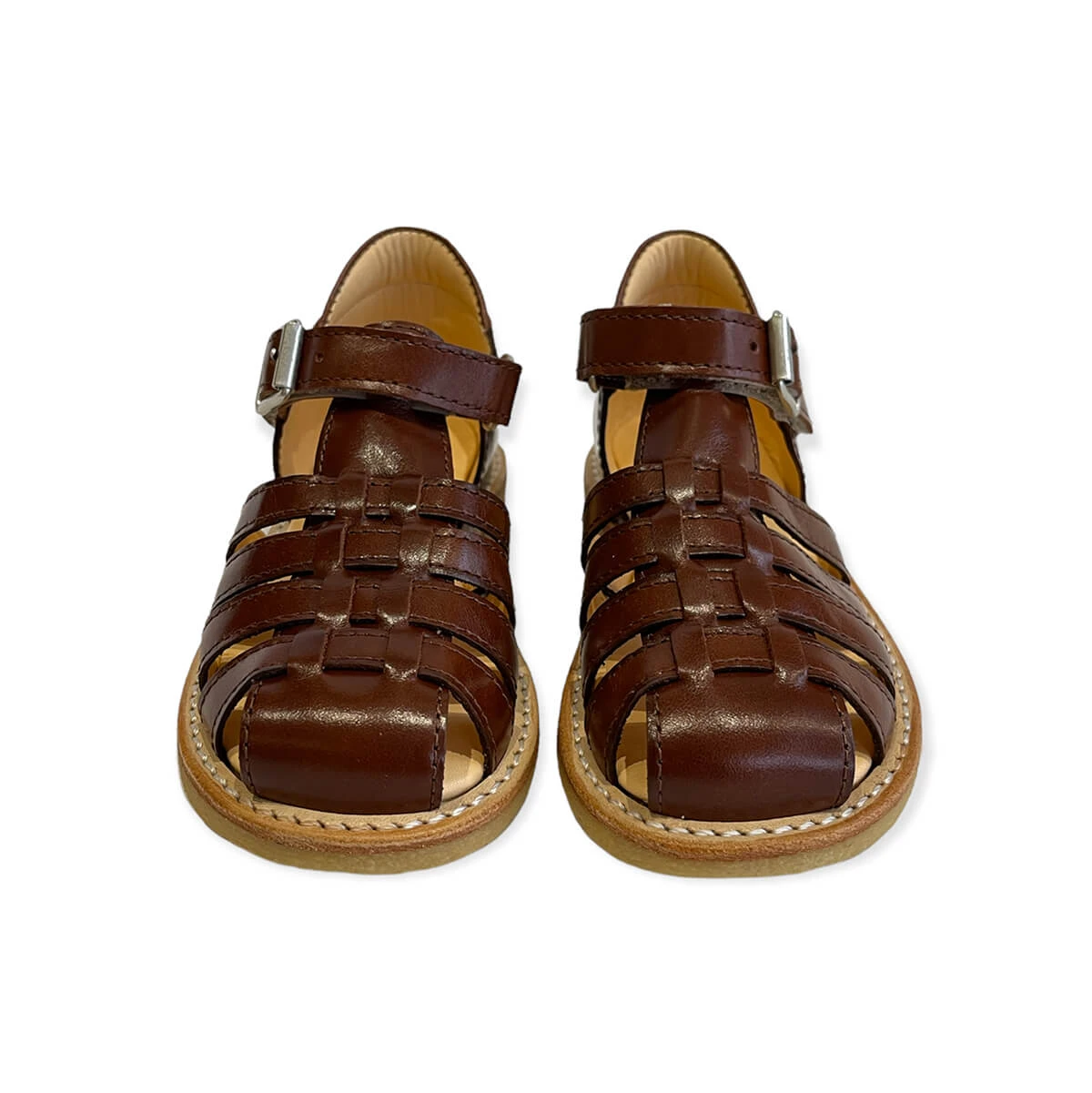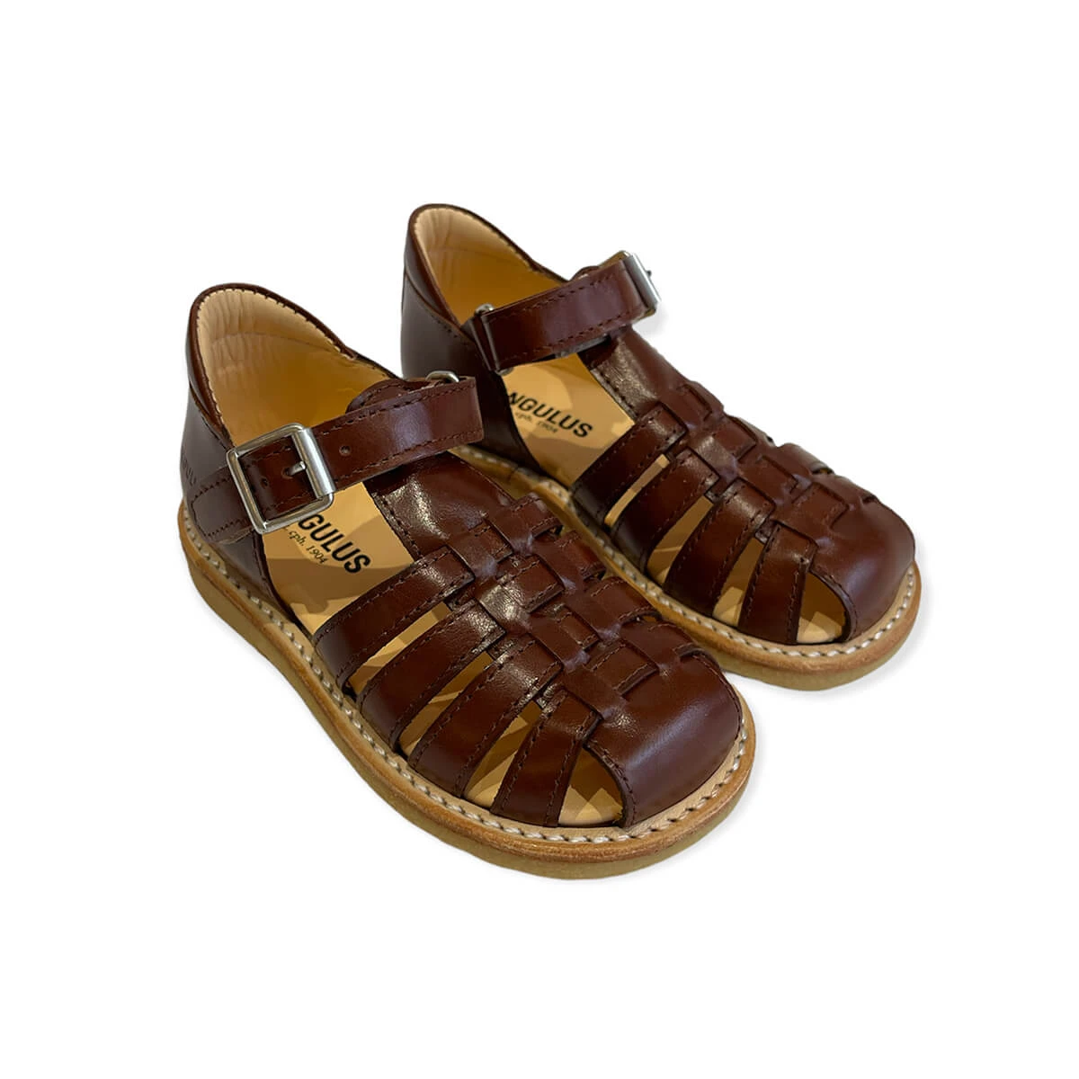 Leather sandals by Angulus. Sandal with woven front and adjustable velcro closure with buckle detail. Closed toe and solid heel cap for maximum support. Soft and flexible crepe rubber sole. Lined with 100% chrome-free leather.