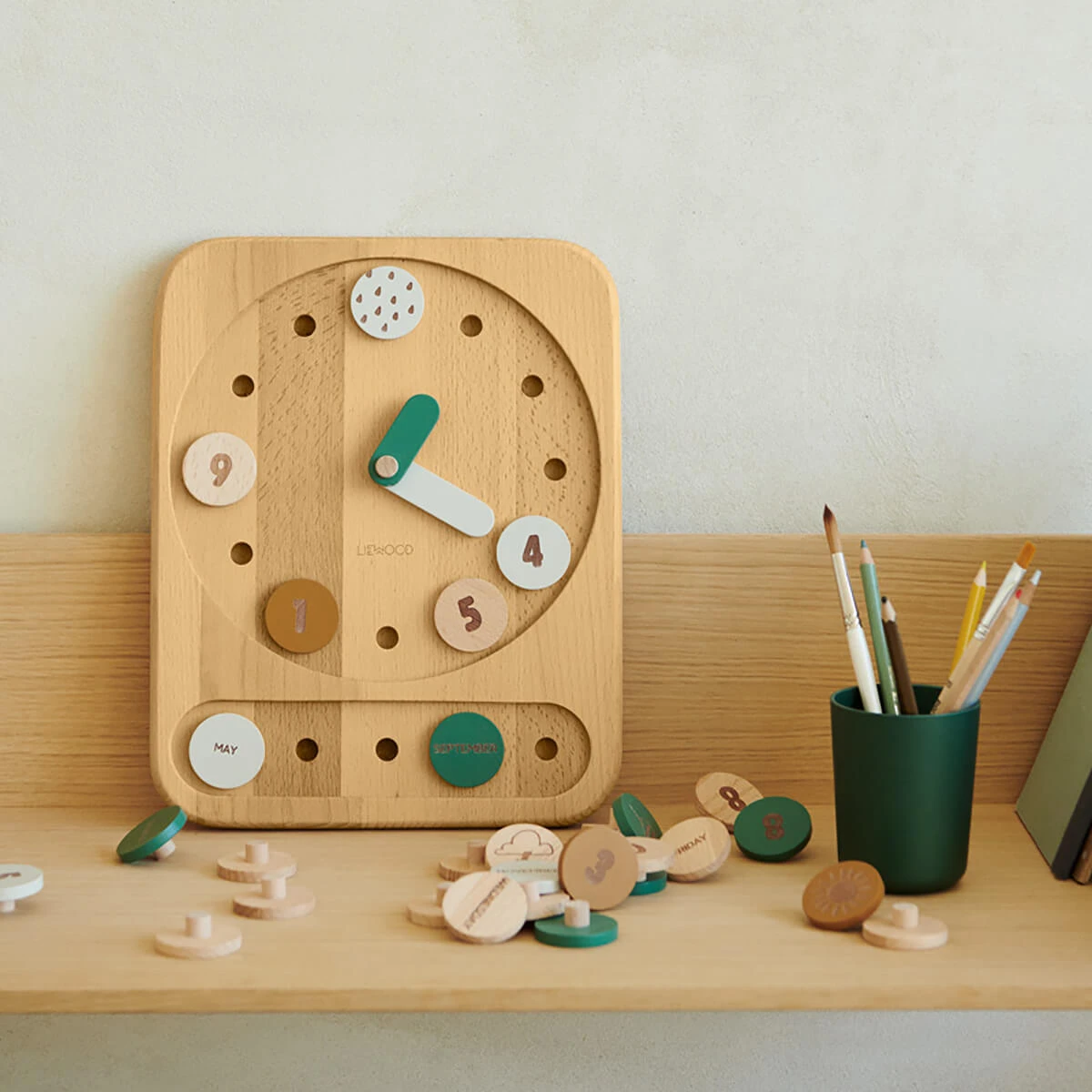 Yelena toy clock by Liewood. With interchangeable units, this wooden toy clock is a fun way to learning time, weekdays and date of the month. The set includes numbers, months names, weekday names and different weather stations, all delivered in a storage bag.