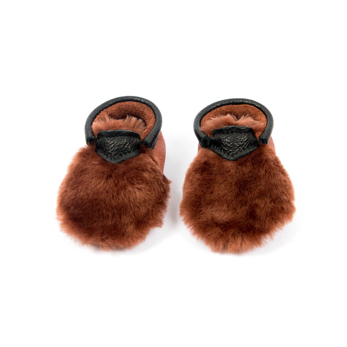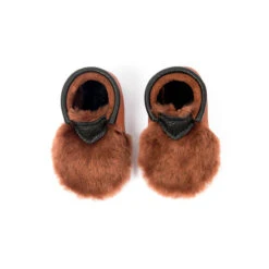 Soft leather moccasins with sheepskin front by Amy & Ivor.  A modern and simple, well fitting foot shaped design based on the design of a traditional moccasin. They are an easy to put on elasticated design that really do stay on little feet.  Hand made shoe made from vegetable tanned chrome free leather that is naturally soft, supple and breathable.  The soft soled structure is kindest even to the tiniest of developing feet.  The soft leather sole is ideal for indoor and light outdoor use in dry conditions, protecting little feet and allowing young walkers to still feel the surfaces they tread upon.  The best footwear for their developing sense of balance.