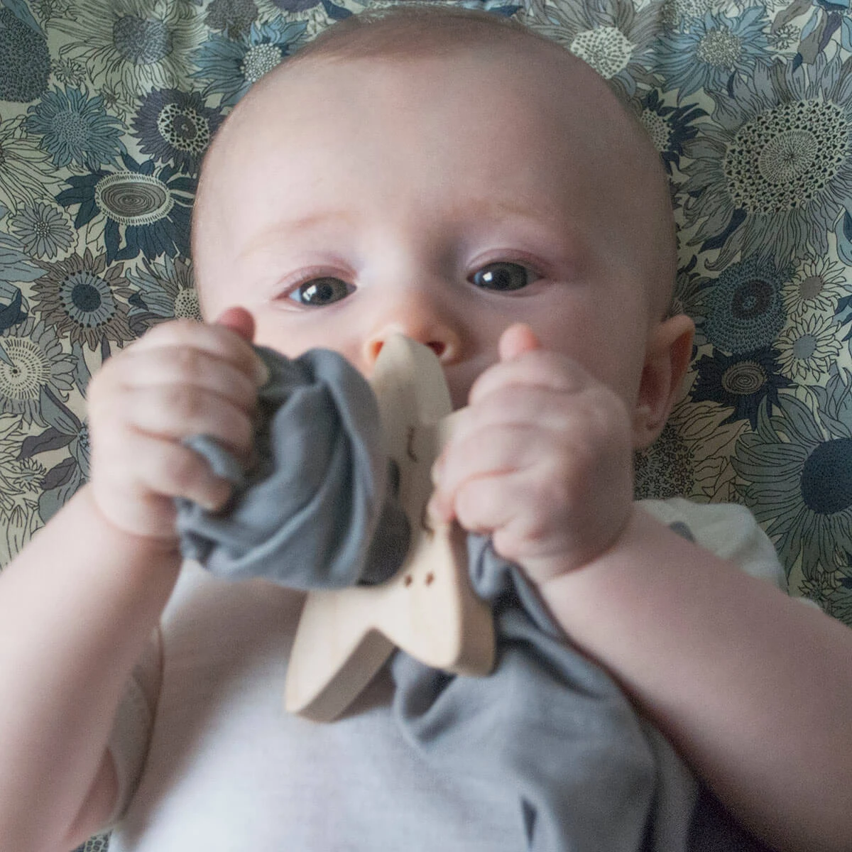 We love these natural teethers by Loullou, perfect for tying onto the baby gym too.
