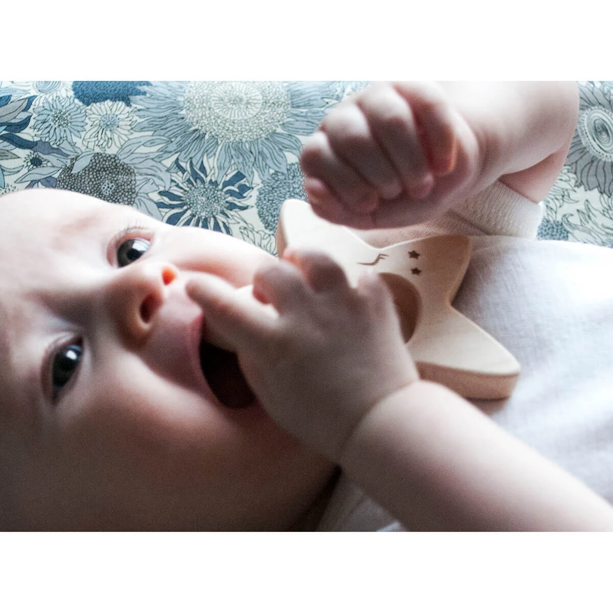 Star shaped natural baby teether by Loullou.  Made from selected eco-friendly Maplewood from FSC-certified suppliers, absolutely free of any chemicals.  With rounded edges that are sanded and smoothed to naturally soothe sore and delicate gums, and a hole for your little one to grab and hold.  Can also be tied to the 1st Play baby gym by Loullou and used as a baby gym toy.