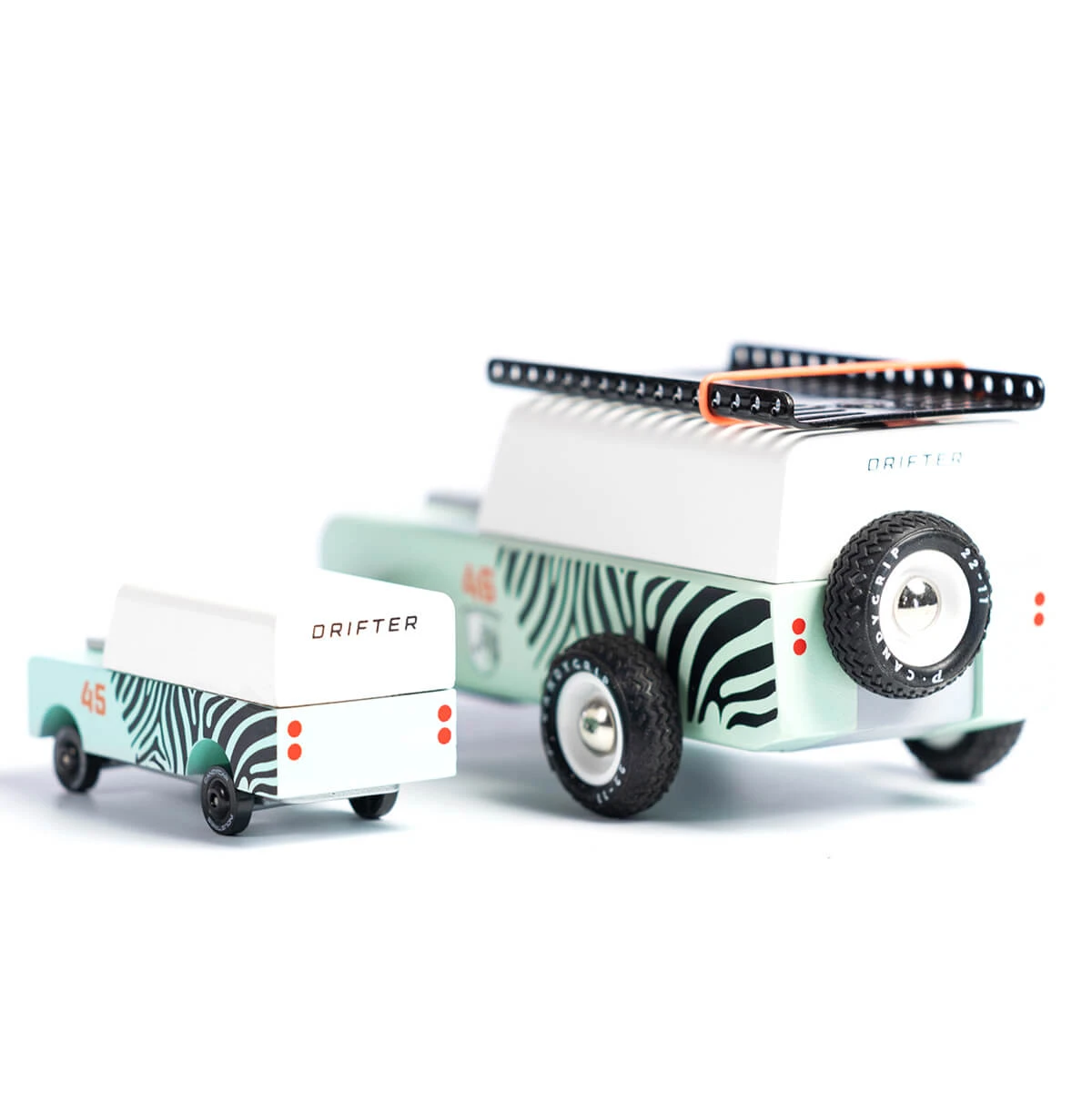 Zebra Drifter Mini Candycar By Candylab Toys. The Americana Drifter was such a hit Candylab had to create a mini-me. Ready for the next mountain adventure this tiny truck is geared up with a 5th wheel for that flat tire that you hope you never get.