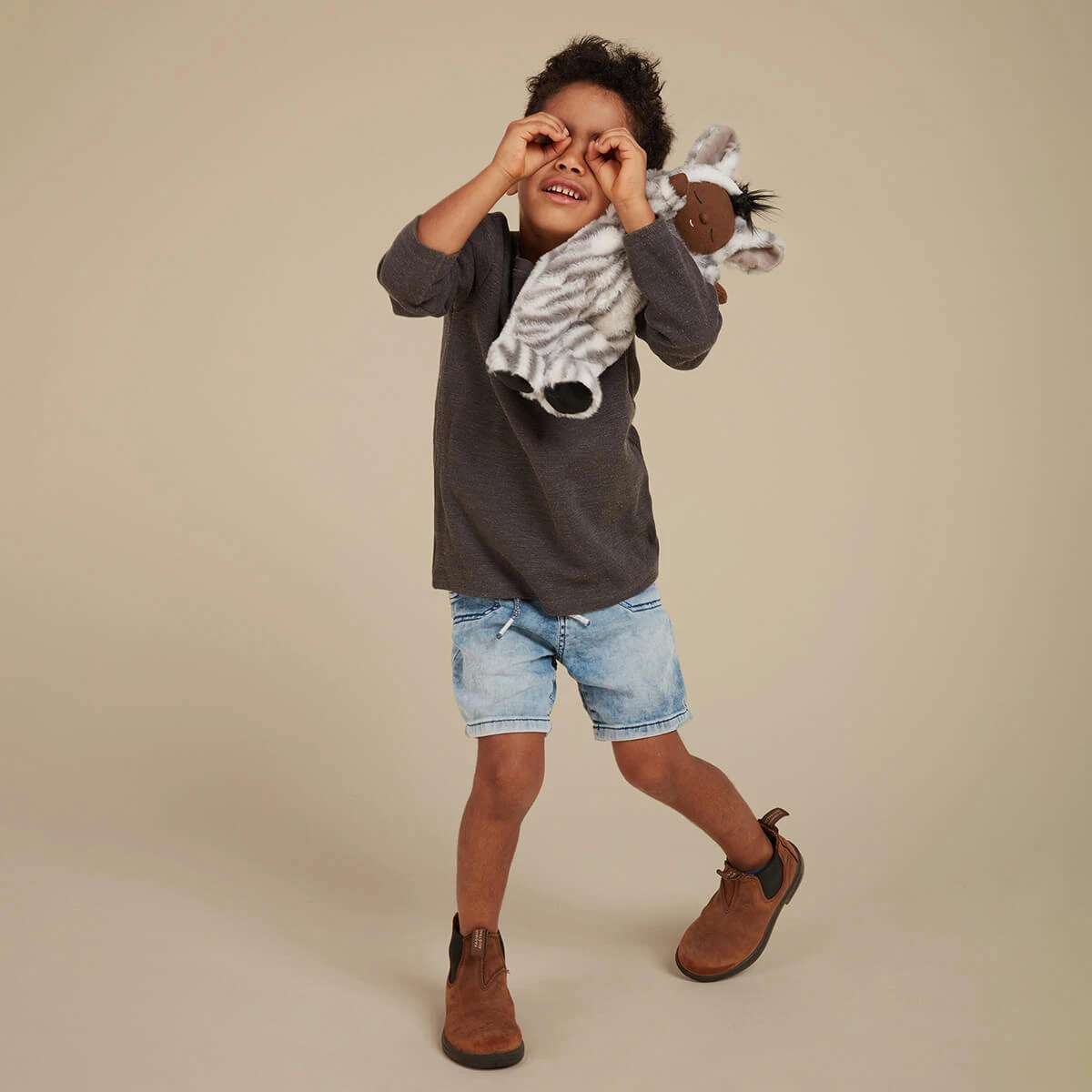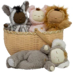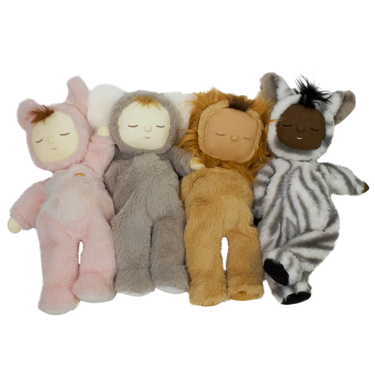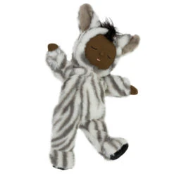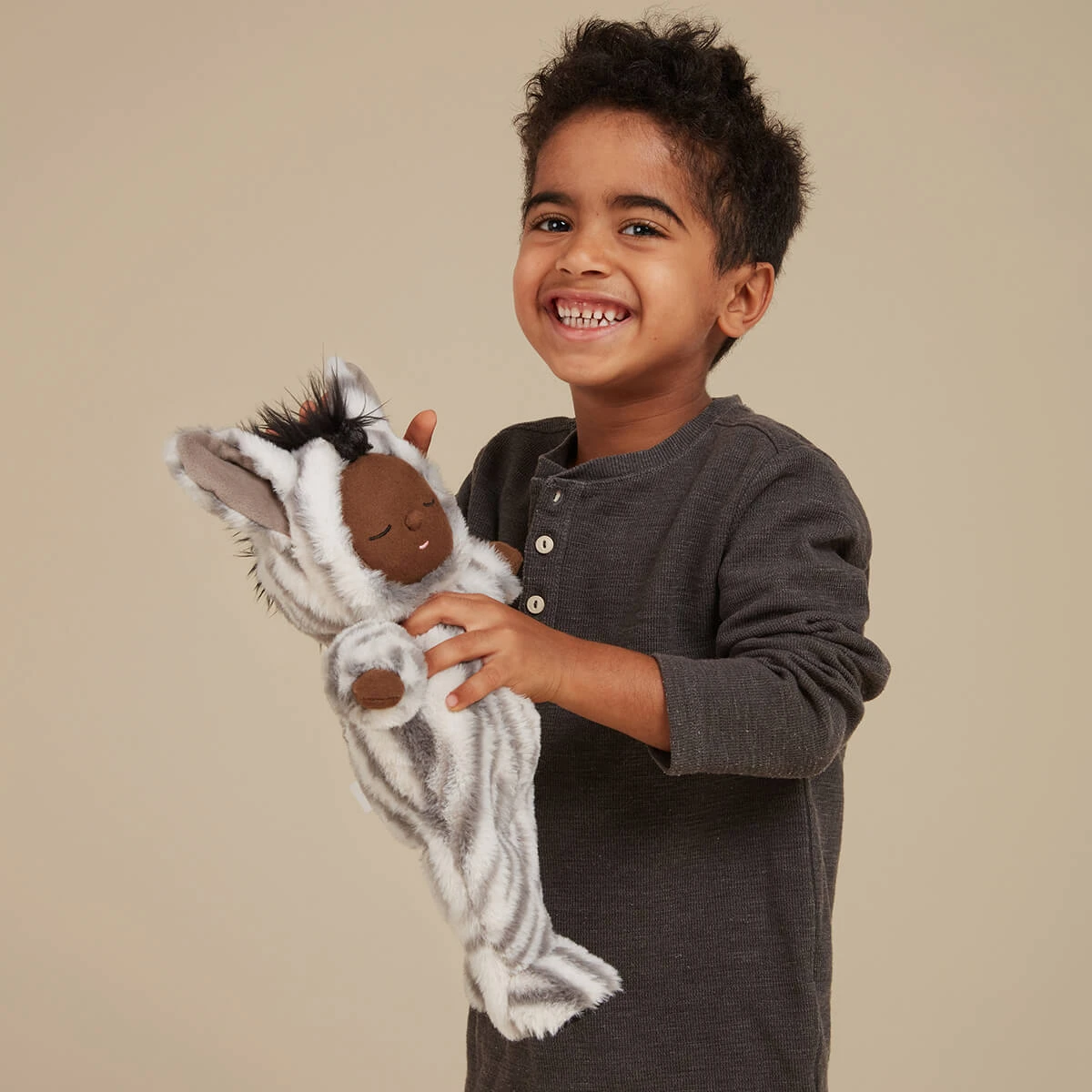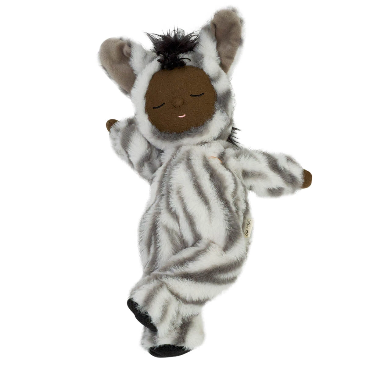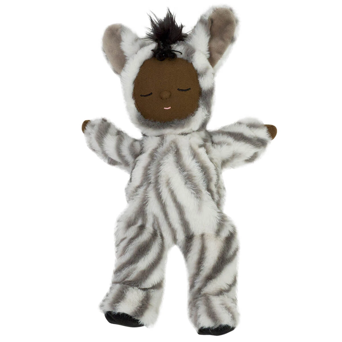 Zebra Mini Cozy Dinkums doll by Olli Ella. Zebra Mini, so cuddly and cute, loves to doze in its soft fluffy suit. Made for snuggles and snoozy days, this velvety little Cozy loves to play! Zebra Mini is poseable, made from the plushest outer and features the sweetest embroidered face with a little tuft of hair. Each Cozy Dinkum wears a non-removable suit with two soft furry ears and a rainbow right over their heart. Zebra Mini is a beautiful gift for newborn babies or would make a lovely addition to your Dinkum Doll family for older kids too.
