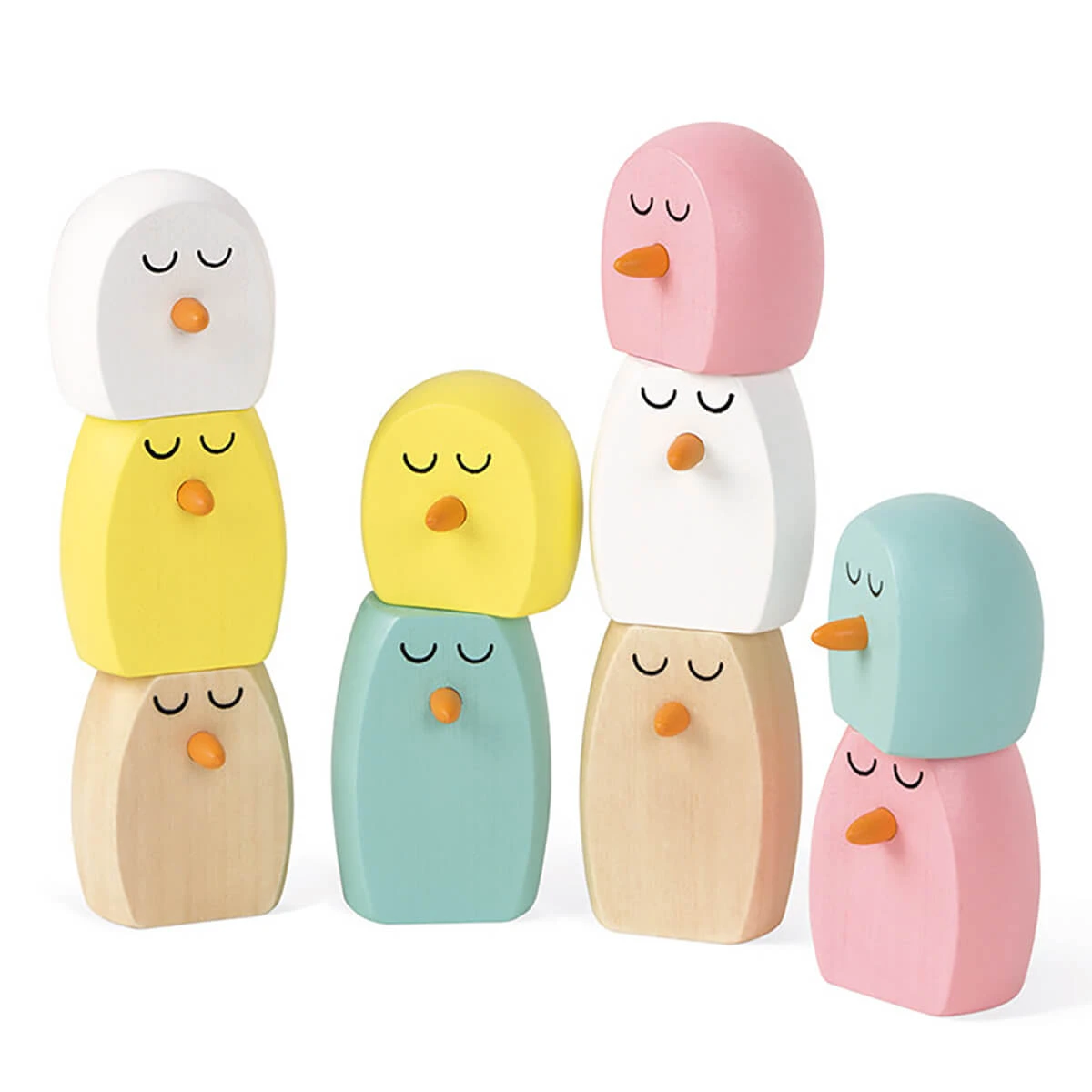 Zigolos flamingo balancing game by Janod.  Solid wood balancing game comprised of a pink flamingo with removable wings, a culbuto base and ten small chicks. The aim of the game is for each player to distribute the chicks along the wings of the flamingo without the chicks falling off. But be careful! The person who causes the chicks to fall off loses the game!